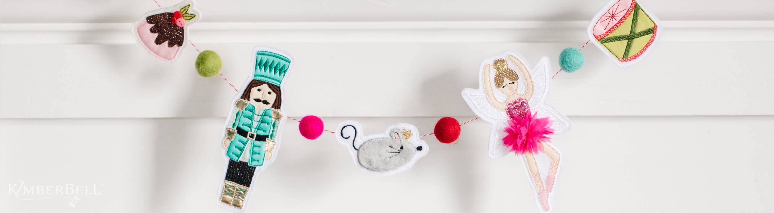 But “time flies," as they say, so it wasn’t long before my five designs were complete. After cutting everything out and gluing the button “cherries” to the top of my Dome Cake, all that was left to do was to take a needle and string my garland together with Kimberbell Twine and those darling Sugar Plum Jubilee Wool Felt Balls. And although my time at the official event is over, I’m looking forward to more embroidery fun with the SEVEN extra designs on my design CD! I can’t wait to make the Mouse King, Swan, Peppermint Swirls, Peppermint Stick, Trees, Ornaments, and Holly Berries…