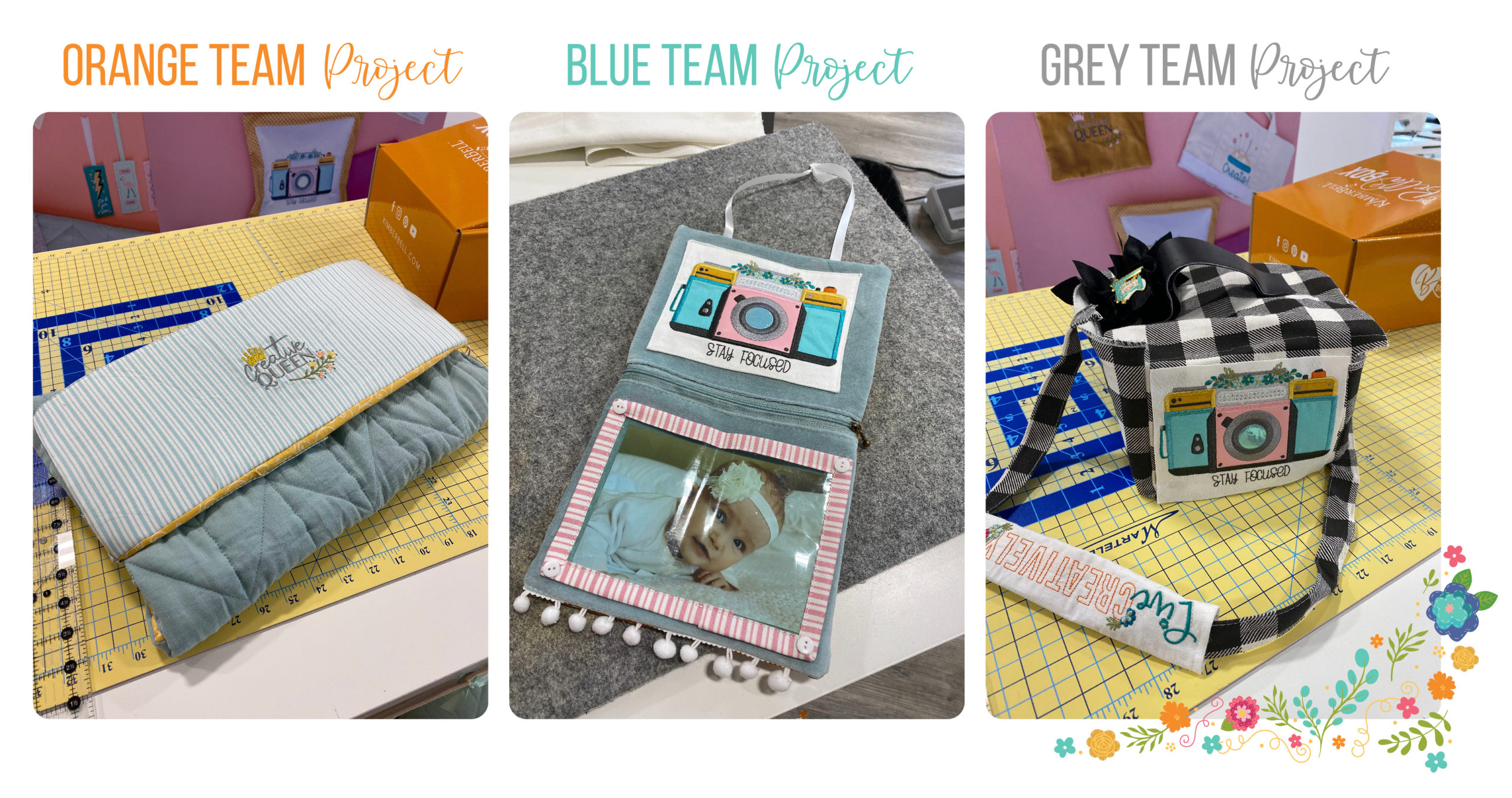 Emily, Todd, and Deanna got busy making a darling camera case from their Buffalo Check Tote, complete with a shoulder pad, Kimberbell Bouquets: Pull Flowers, buttons, and a zipper pocket for snacks! (Way to "Stay Focused," Grey Team!)
