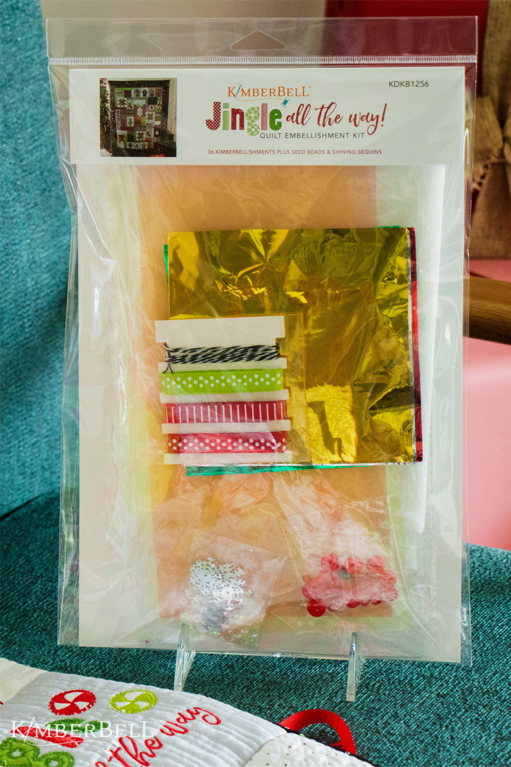 So, what can you anticipate receiving in the Jingle All the Way Embellishment Kit? We've bundled everything you need to make your quilt shine, including Sweet as Candy Clear Vinyl, Twine, Mylar, ribbon, tulle, buttons, seed beads, sequins, and even Kimberbell Flexi Foam for added dimension!