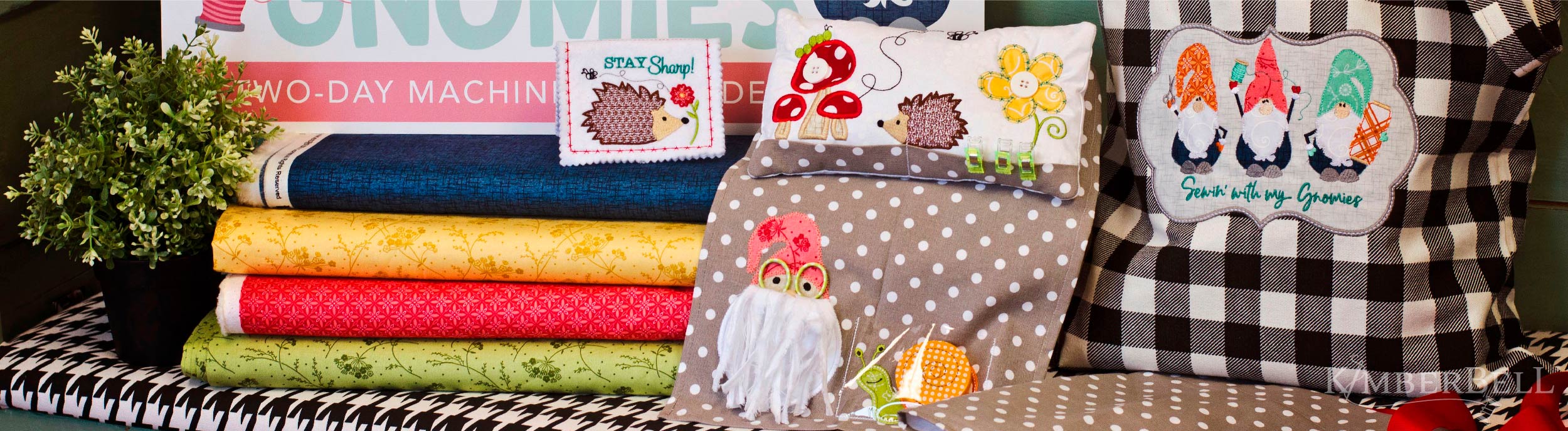 Kimberbell Events (either virtual or in-person) are a delightful place to learn new things, make highly-creative projects, and simply have a great time with other stitching enthusiasts. Sewin' With My Gnomies is no exception! This two-day machine embroidery event includes five darling projects: the Hedgehog Needle Keeper, Gnome Garden Pincushion, The Gnome Knows Sewing Caddy, The Buffalo Gnomes Tote, and the Pocket Full of Posies Apron. Now, I've been to several Kimberbell Events, but I'll admit to feeling just a little intimidated with this one. Gnomies was my first two-day event, and the projects seemed a little more involved than anything I'd done before. But I'm happy to report that the wonderful teachers and those full-color, step-by-step Kimberbell instructions saw me through yet again!