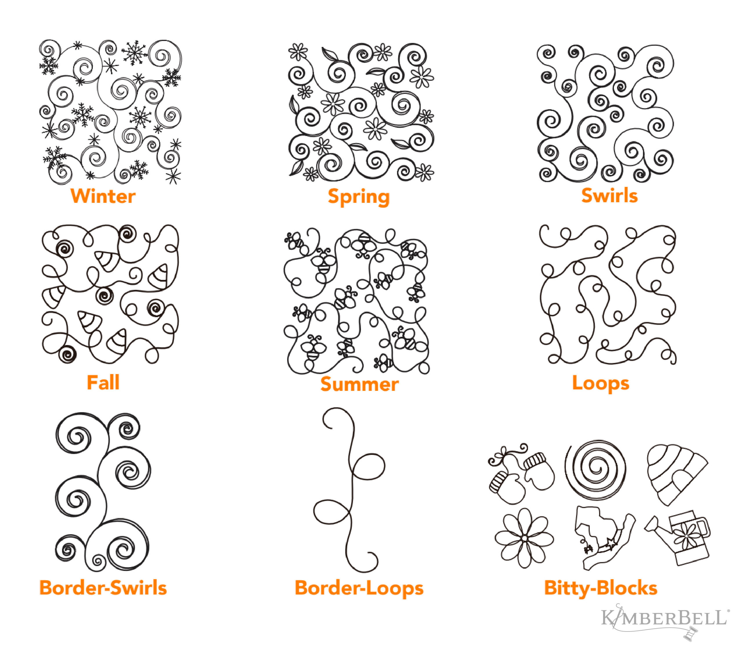 Kimberbell’s block-by-block quilting designs include batting and tack-down lines and do not work with Clear Blue Tiles. Ideal for use with Orange Pop Rulers, these designs are often directional and include travel lines that are sewn into the seam.