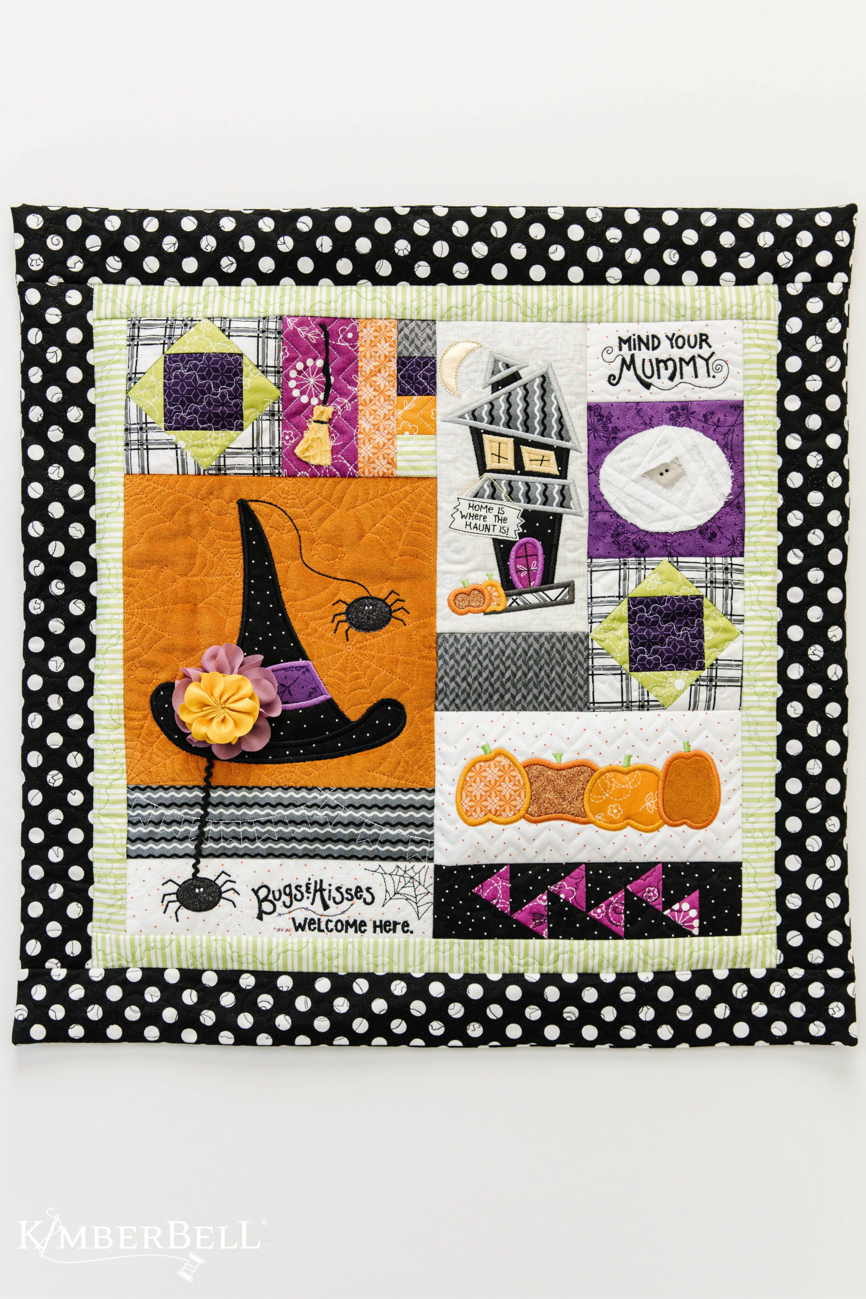 You'll likely see block-by-block quilting on projects like Kimberbell Bench Pillows, feature quilts, and other projects like the Home is Where the Haunt Is pillow shown here:
