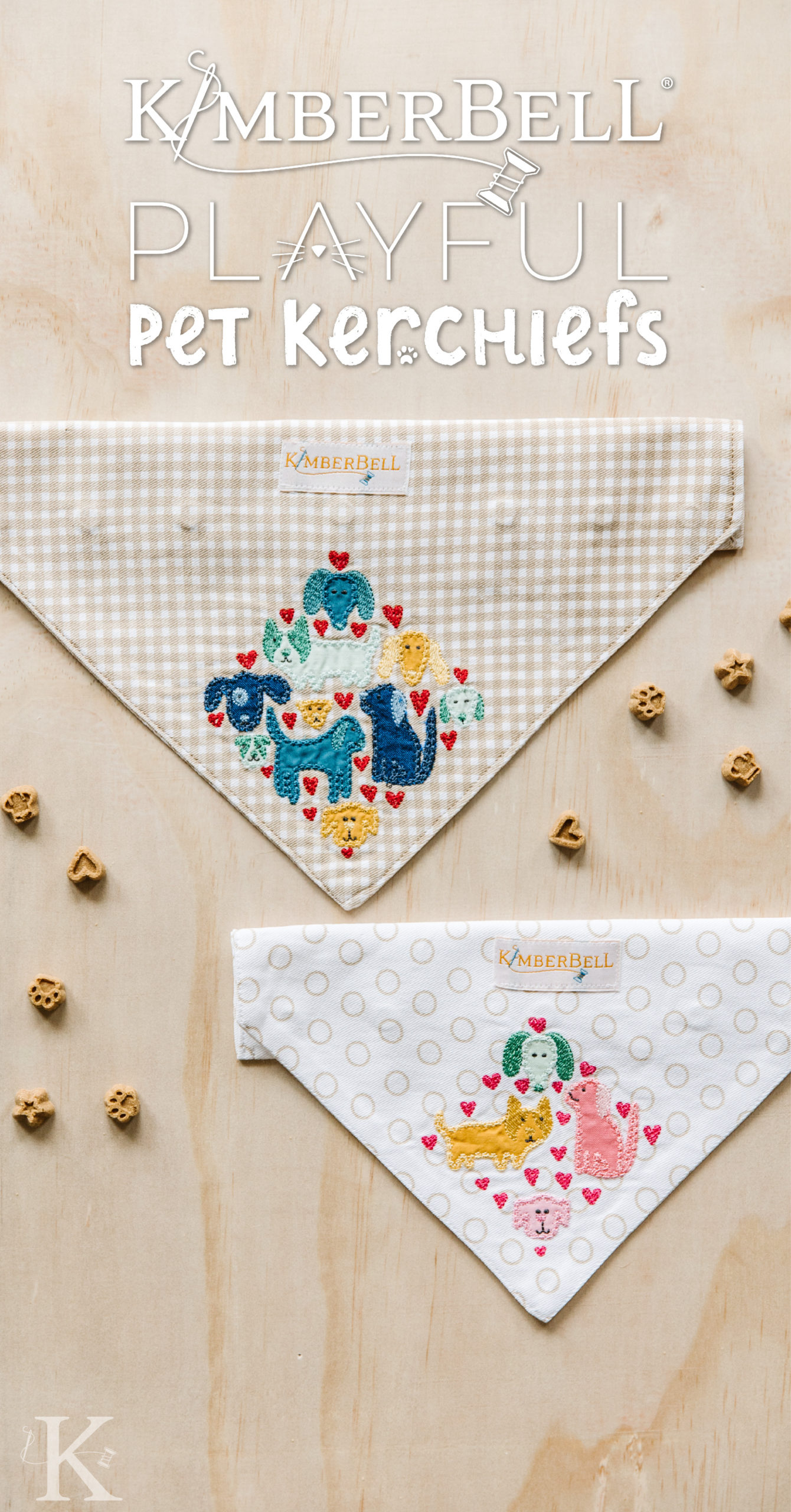 Kimberbell Playful Pet Kerchiefs are now available through your favorite quilt shop! Just imagine the paws-ibilities, from pet groomers and dog walkers to cat lovers and more. It's so easy to embroider a Pet Kerchief Blank and dress up your furry (or feathered) friends!