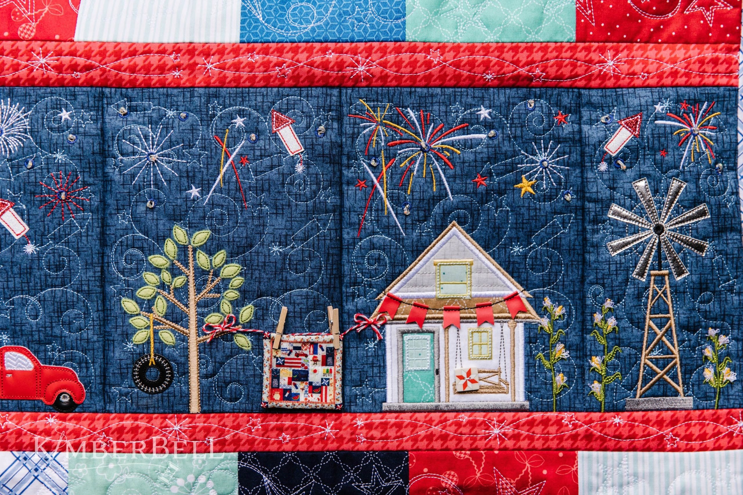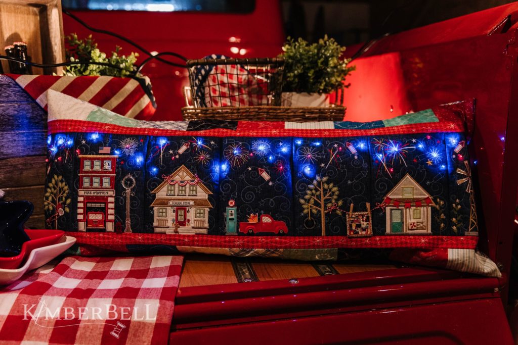 All of these memories and more are why I absolutely love Kimberbell’s Main Street Celebration Bench Pillow, available for both sewing and machine embroidery. Each block evokes powerful feelings for me, from the bicycle (Is that me on my Sky Queen?) to the colorful Fairy Light fireworks. When I see this Bench Pillow, I don’t only see the shiny Embroidery Leather, sparkly Applique Glitter, darling buttons and other embellishments—although these dimensional details make this pillow absolutely stunning. Rather, I think of the people behind the stitches: business owners, neighbors, farmers, and hometown heroes.