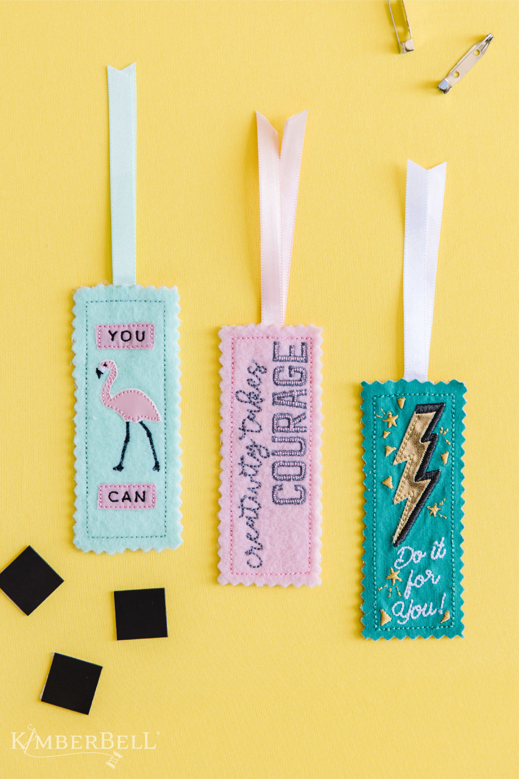 Take time to Be Inspired with three sentiments to make you smile: “Creativity takes courage,” “Do it for you,” and “You can.” Choose fabric, ribbon, and other embellishments from The Bella Box to make bookmarks, pins, magnets, and more!