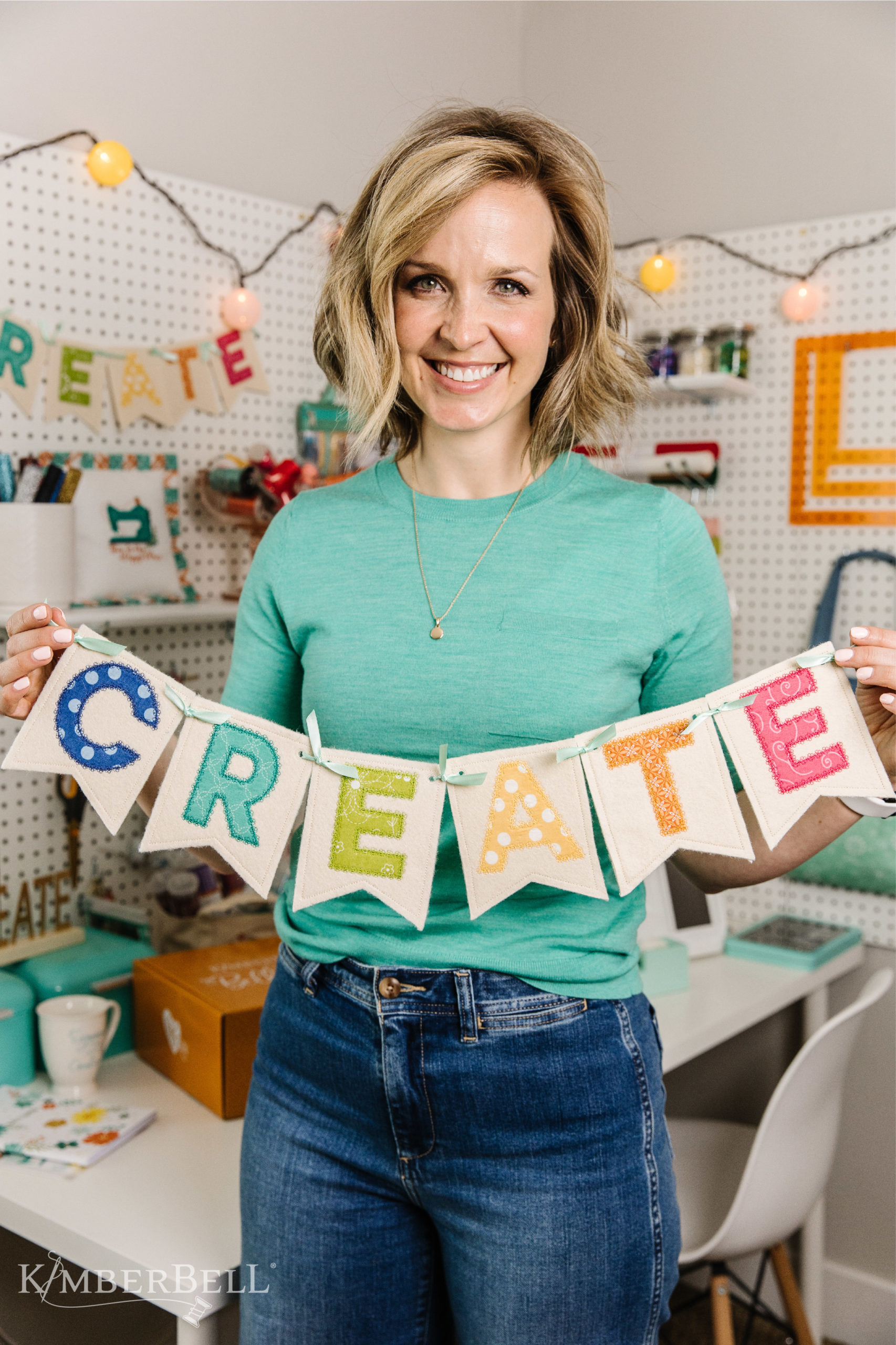 Brighten your creative spaces with Kimberbell’s “Create” Pennant Banner! Stitch cheerful applique letters on a background of creamy Buttermilk Embroidery Felt. , then add eyelet holes to string pennants together.