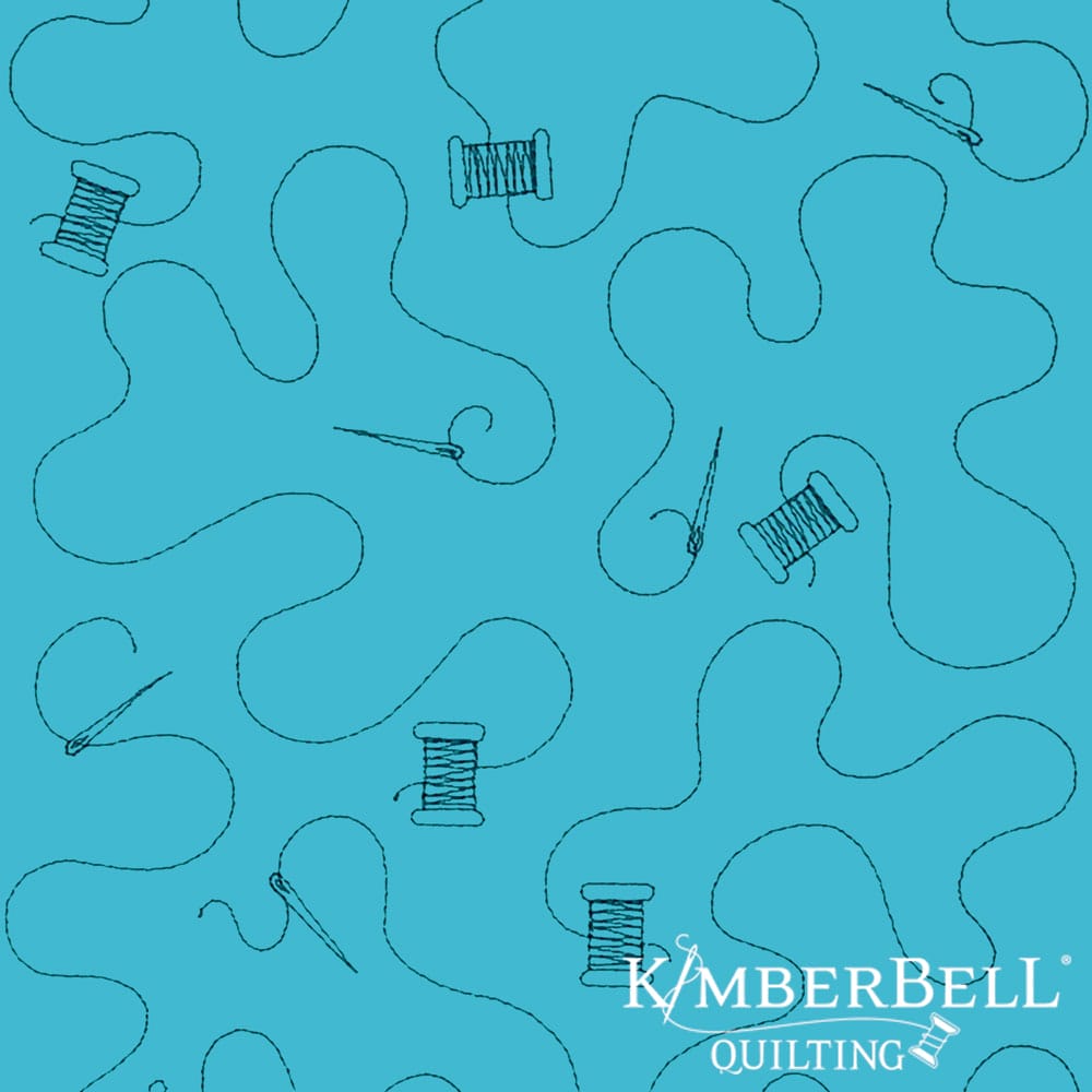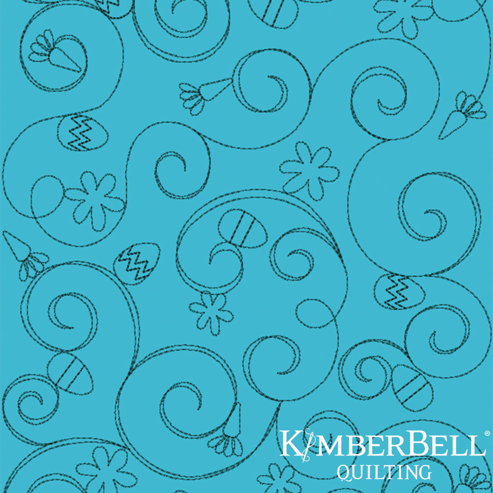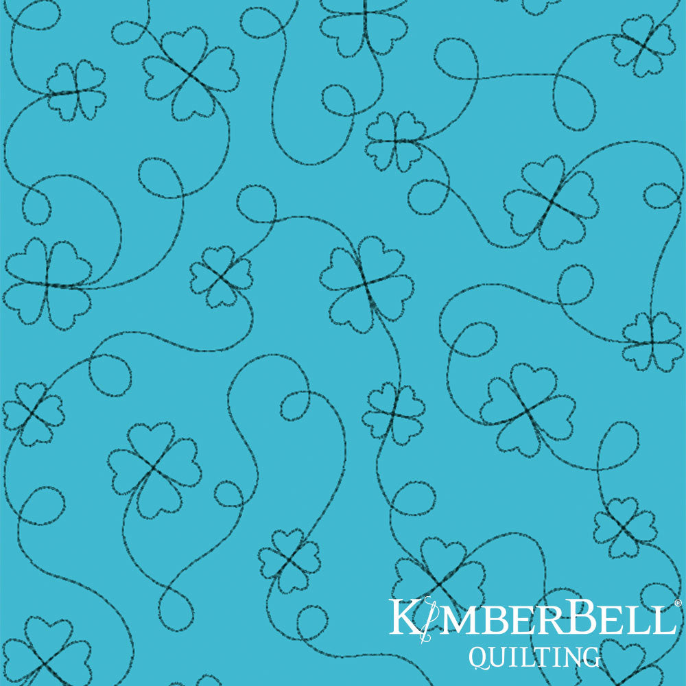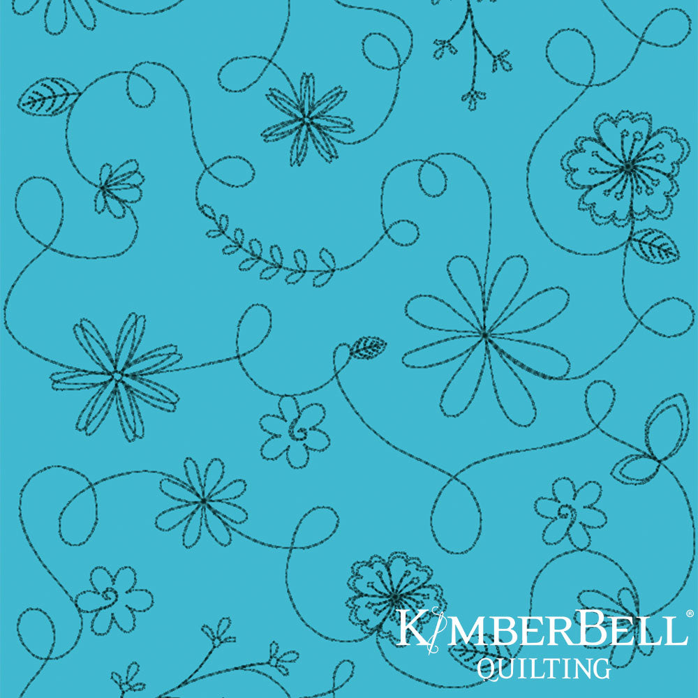 Teal fabric with floral and swirl patterns and Kimberbell Quilting logo.