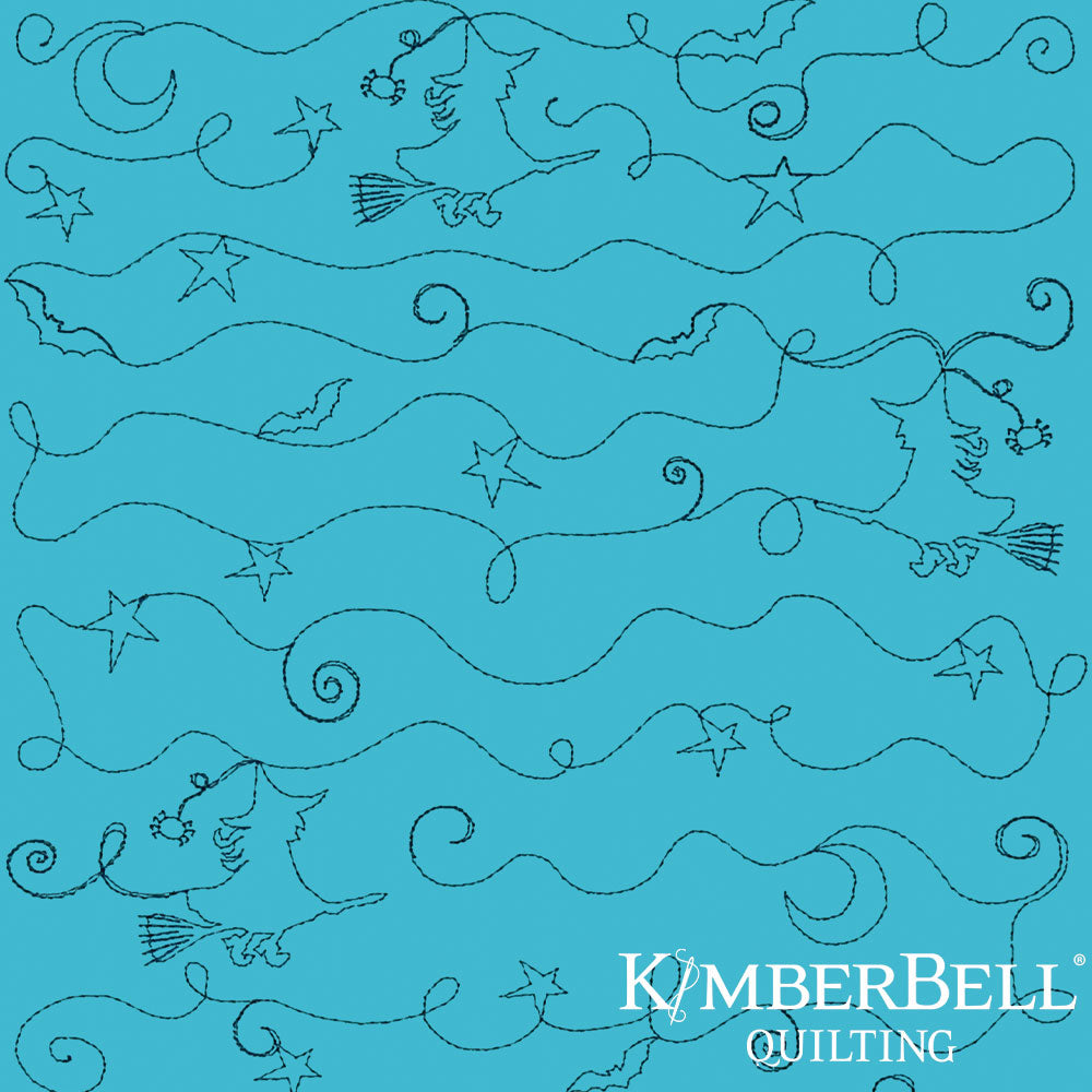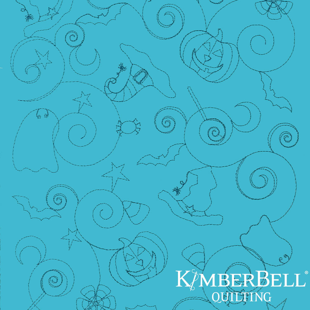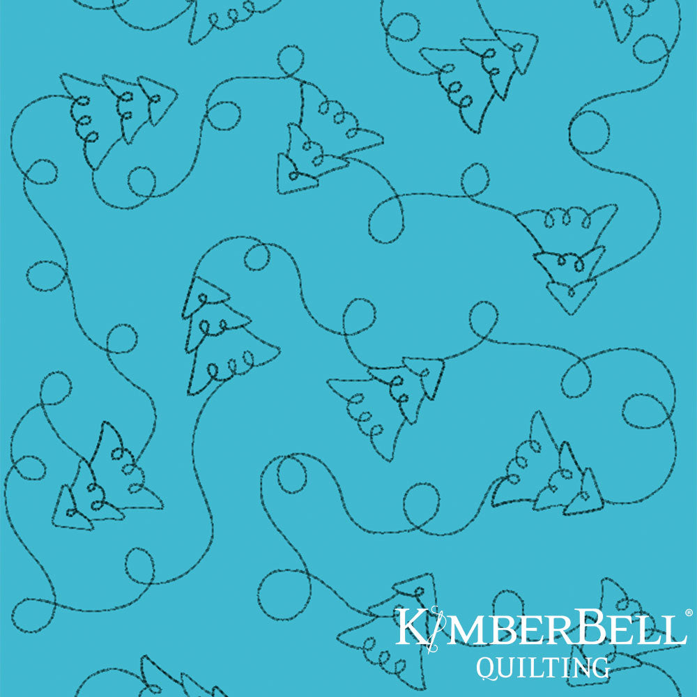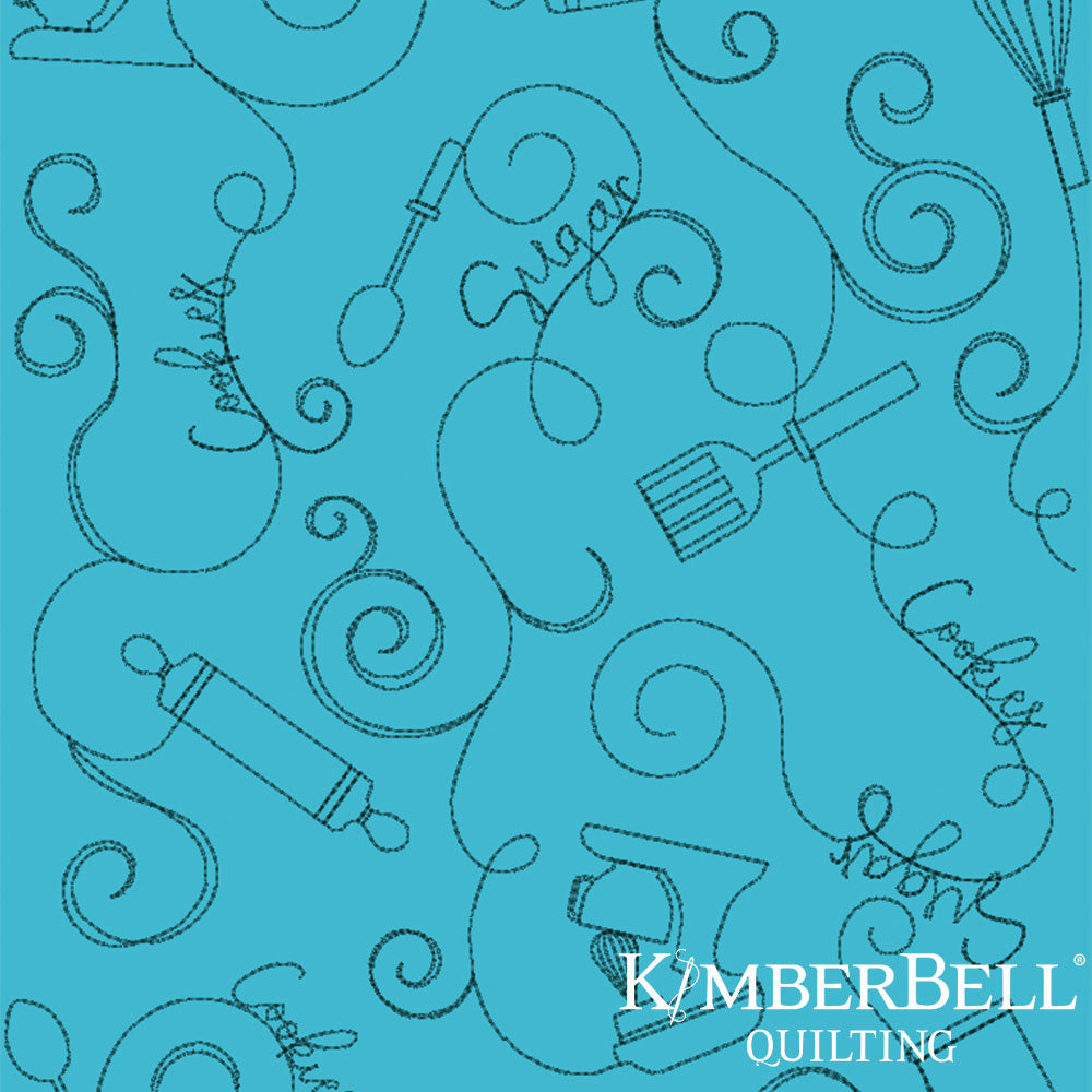 Teal fabric with floral and swirl patterns and Kimberbell Quilting logo.
