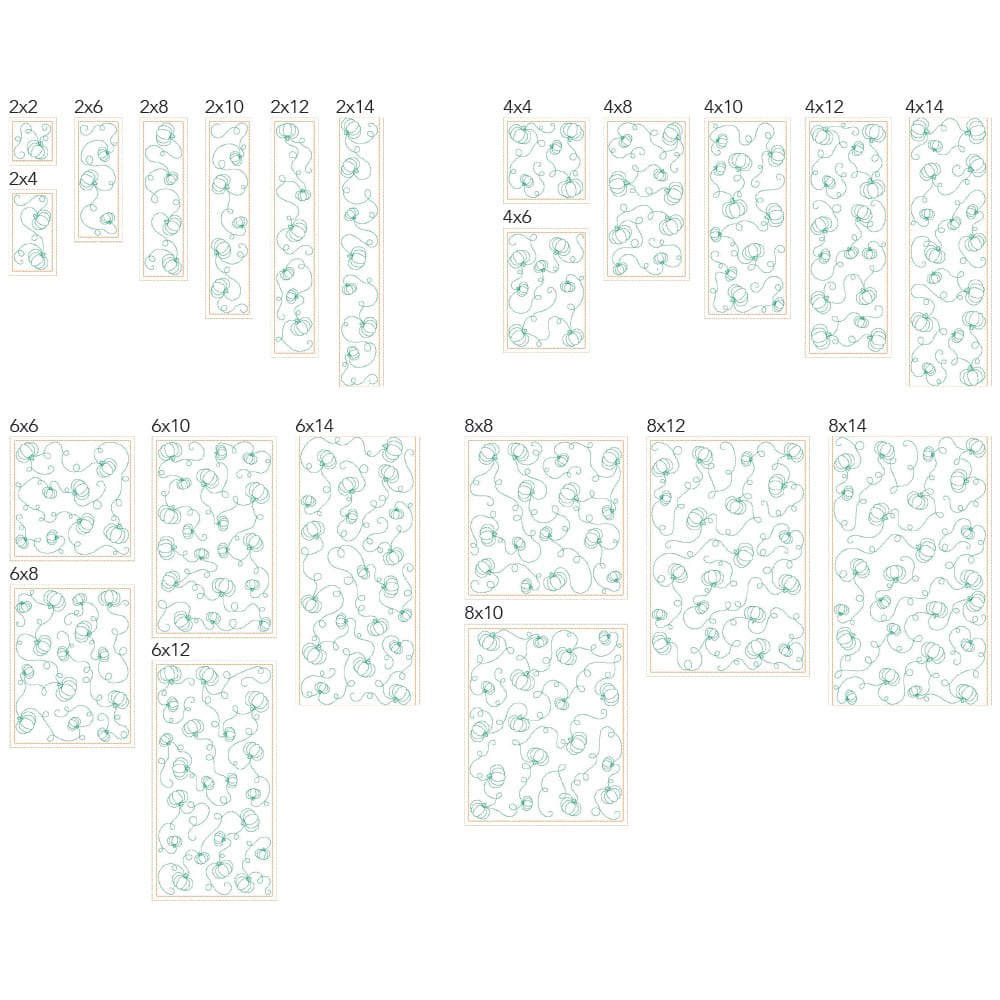 Again, your purchase of Autumn 2 includes 44 file sizes: 22 files for the Clear Blue Tiles ® quilting method and 22 files for the Block-by-Block quilting method. Files will fit within any size of machine embroidery hoop, from 4×4 up to 9×14!