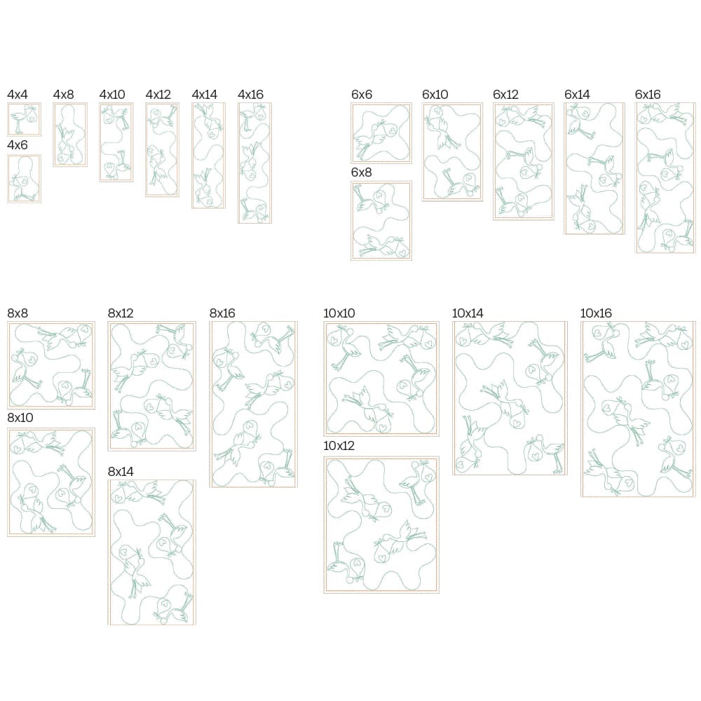 *All 22 files are designed to work with embroidery hoop sizes from 4×4 to 10×16. Check the Embroidery Field Size Chart to double check your machine’s capabilities for each file size.