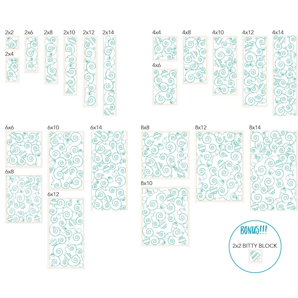 Again, your purchase of Celebration 6 includes 46 file sizes: 22 files for the Clear Blue Tiles ® quilting method, 22 files for the Block-by-Block quilting method, and 2 Bitty Block files. Files will fit within any size of machine embroidery hoop, from 4×4 up to 9×14!