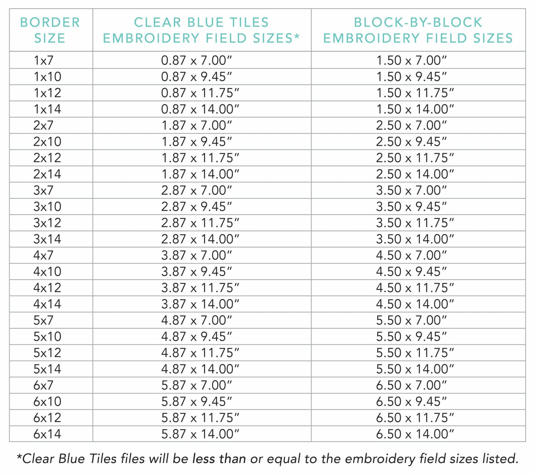Again, your purchase of Celebration Border 1 includes 48 file sizes: 24 files for the Clear Blue Tiles ® quilting method and 24 files for the Block-by-Block quilting method. Files will fit within any size of machine embroidery hoop from 5×7 up to 9×14!