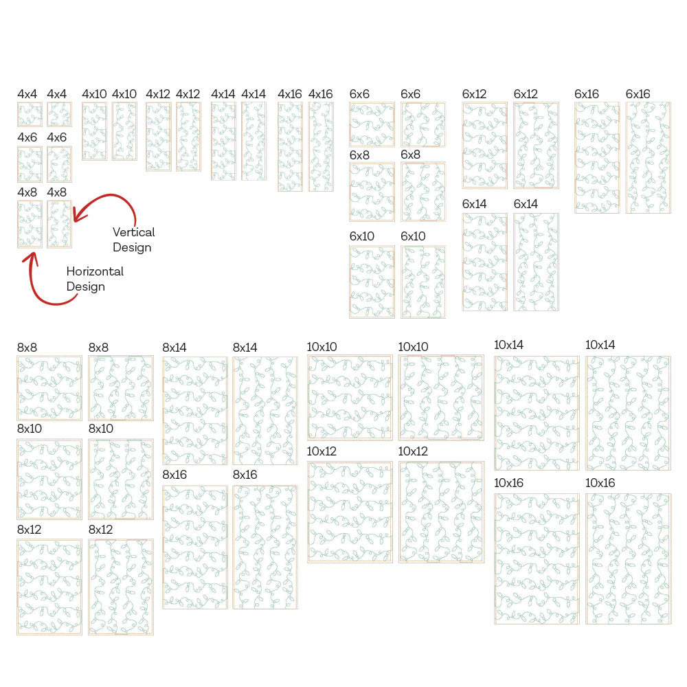 *All 44 files are designed to work with embroidery hoop sizes from 5x7 to 10x16. Check the Embroidery Field Size Chart to double check your machine's capabilities for each file size.