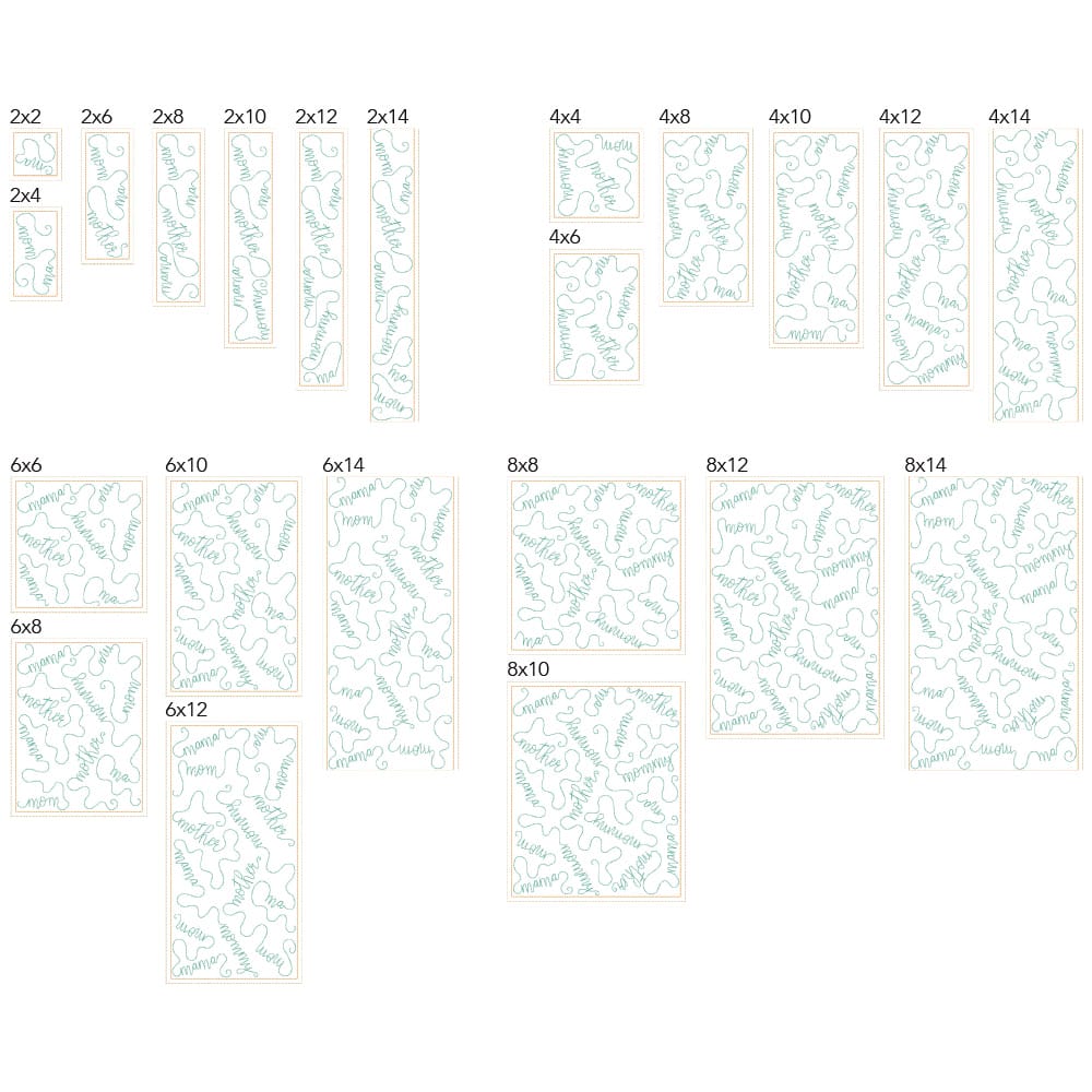 Again, your purchase of Family 1 includes 44 file sizes: 22 files for the Clear Blue Tiles ® quilting method and 22 files for the Block-by-Block quilting method. Files will fit within any size of machine embroidery hoop, from 4×4 up to 9×14!