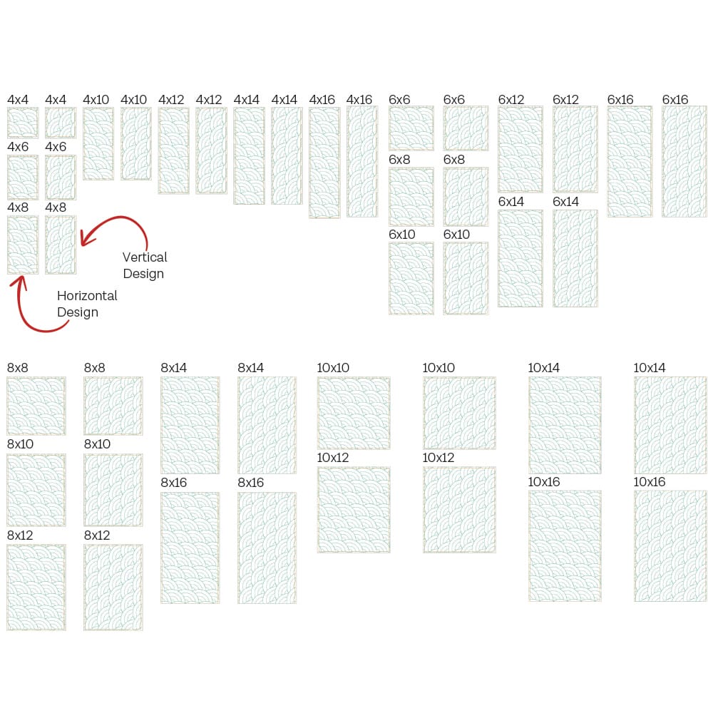 Again, your purchase of the large-scale Fan 1 design includes 44 file sizes: 44 files for the Block-by-Block quilting method. These large-scale design files fit within machine embroidery hoop sizes 4×4 to 10×16!