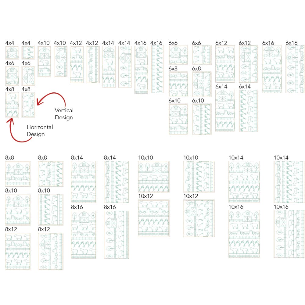 Again, your purchase of the large-scale Farm 1 design includes 44 file sizes: 44 files for the Block-by-Block quilting method. These large-scale design files fit within machine embroidery hoop sizes 4×4 to 10×16!