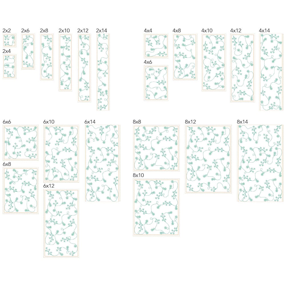 Again, your purchase of Floral 5 includes 44 file sizes: 22 files for the Clear Blue Tiles ® quilting method and 22 files for the Block-by-Block quilting method. Files will fit within any size of machine embroidery hoop, from 4×4 up to 9×14!