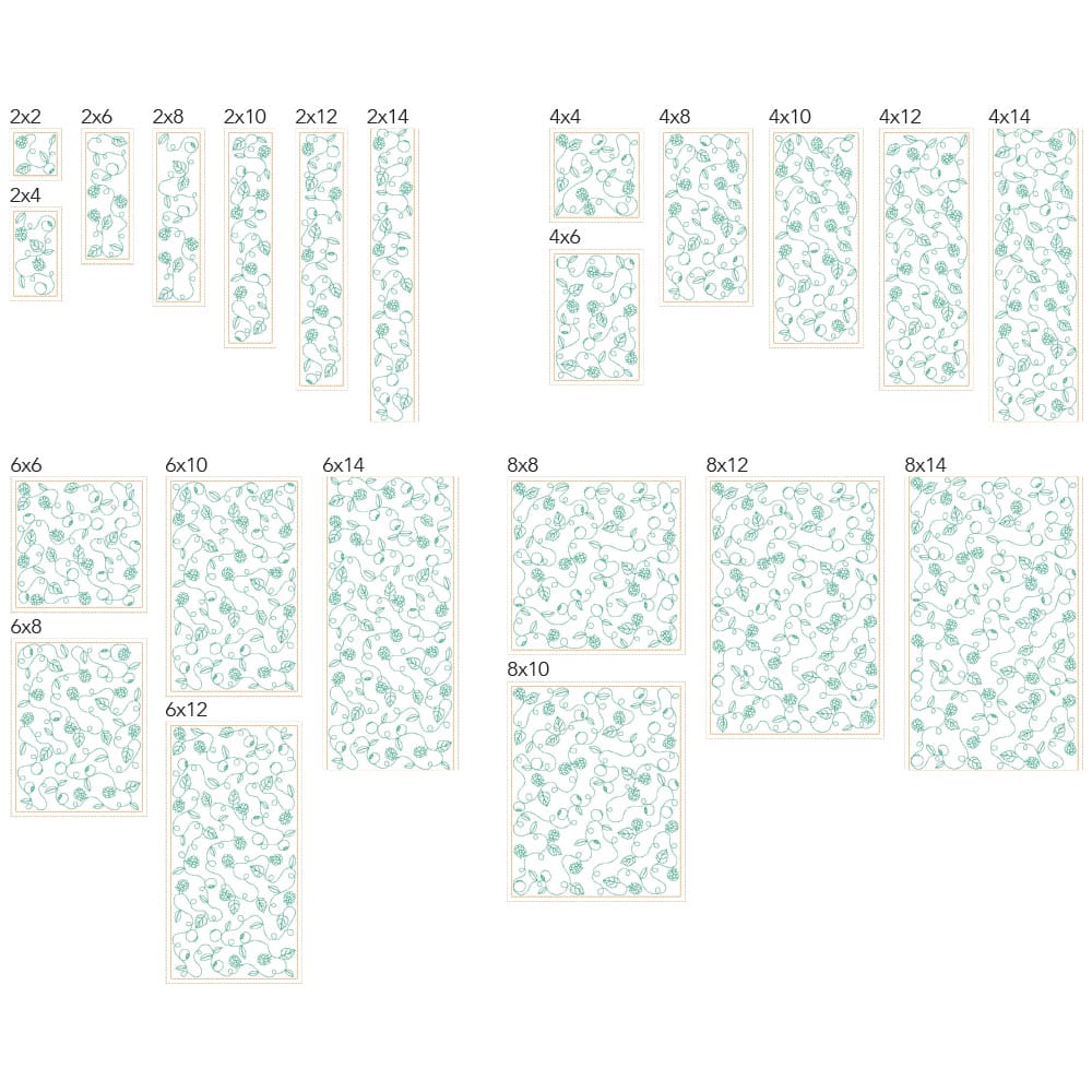 Again, your purchase of Fruit 2 includes 44 file sizes: 22 files for the Clear Blue Tiles ® quilting method and 22 files for the Block-by-Block quilting method. Files will fit within any size of machine embroidery hoop, from 4×4 up to 9×14!