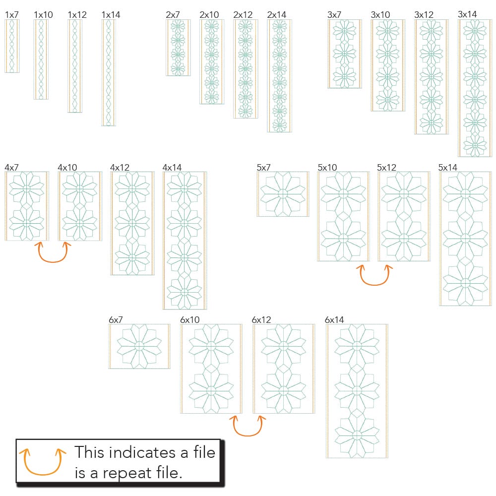 Again, your purchase of Geometric Border 2 includes 24 file sizes for the Block-by-Block quilting method, including 3 repeat files. Files will fit within any size of machine embroidery hoop from 5×7 up to 9×14!