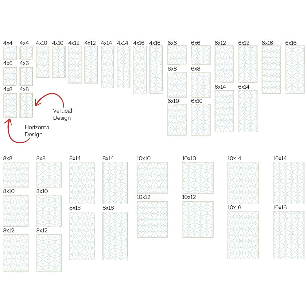 Again, your purchase of the large-scale Hearts 9 design includes 44 file sizes: 44 files for the Block-by-Block quilting method. These large-scale design files fit within machine embroidery hoop sizes 4×4 to 10×16!