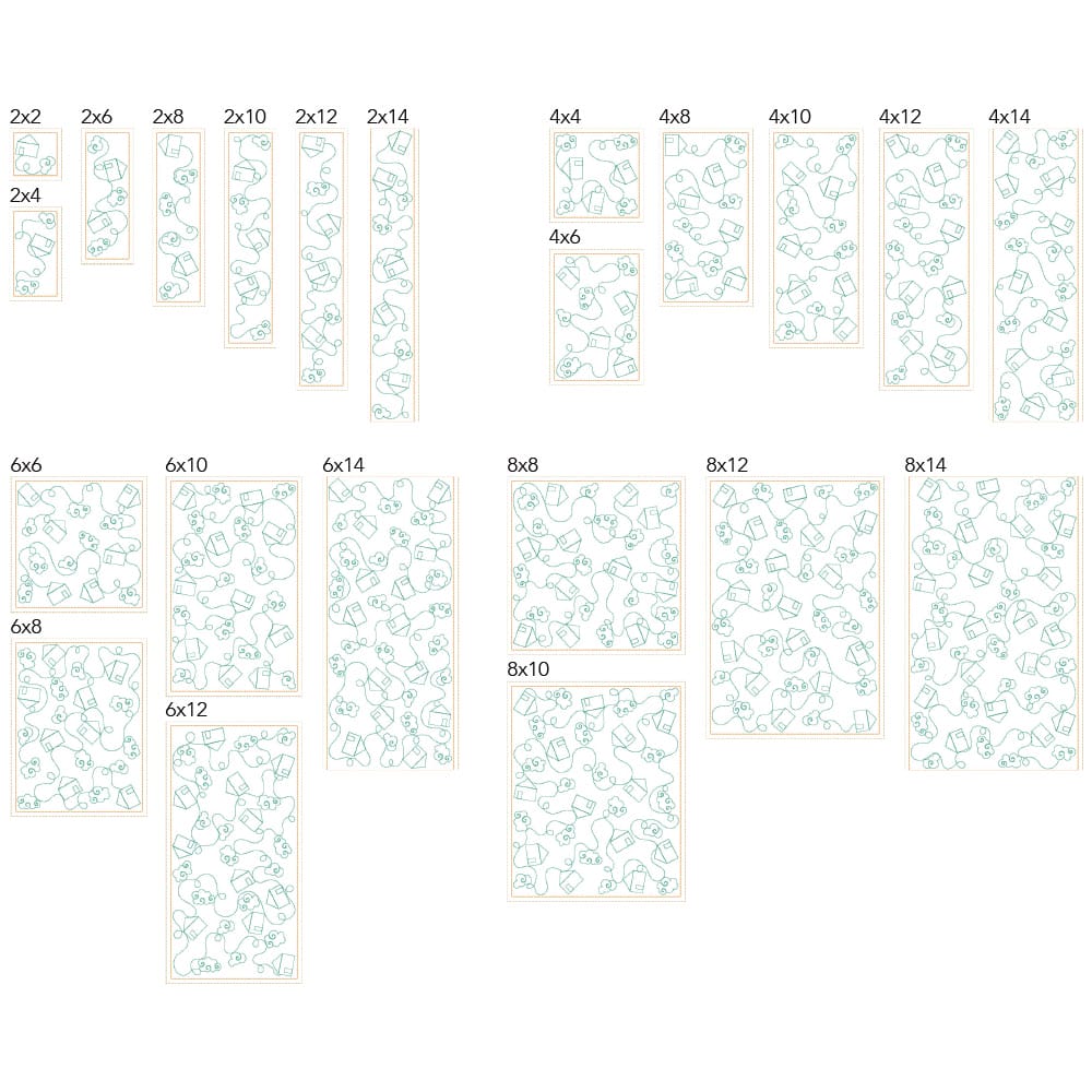 Again, your purchase of House 1 includes 44 file sizes: 22 files for the Clear Blue Tiles ® quilting method and 22 files for the Block-by-Block quilting method. Files will fit within any size of machine embroidery hoop, from 4×4 up to 9×14!