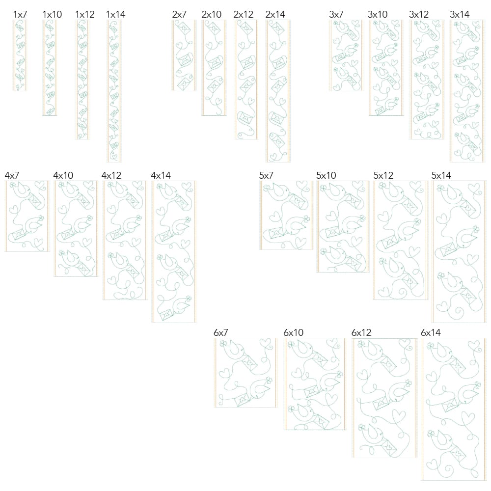 Again, your purchase of Valentine Border 1 includes 48 file sizes: 24 files for the Clear Blue Tiles quilting method and 24 files for the Block-by-Block quilting method. Files will fit within any size of machine embroidery hoop from 5×7 up to 9×14!
