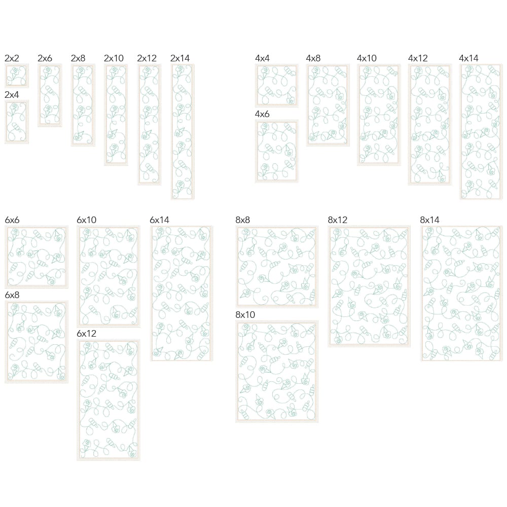 *All 22 files are designed to work with embroidery hoop sizes from 4x4 to 9x14. Check the Embroidery Field Size Chart to double check your machine's capabilities for each file size.