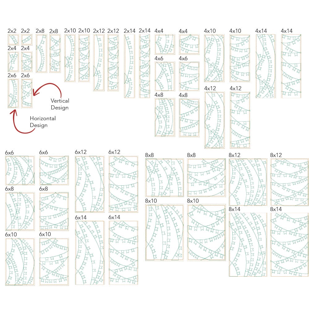 *All 44 files are designed to work with embroidery hoop sizes from 4x4 to 9x14. Check the Embroidery Field Size Chart to double check your machine's capabilities for each file size.