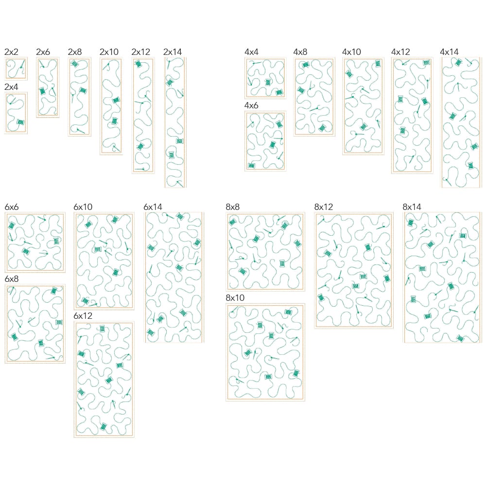Again, your purchase of Hobby 2 includes 44 file sizes: 22 files for the Clear Blue Tiles ® quilting method and 22 files for the Block-by-Block quilting method. Files will fit within any size of machine embroidery hoop, from 4×4 up to 9×14!
