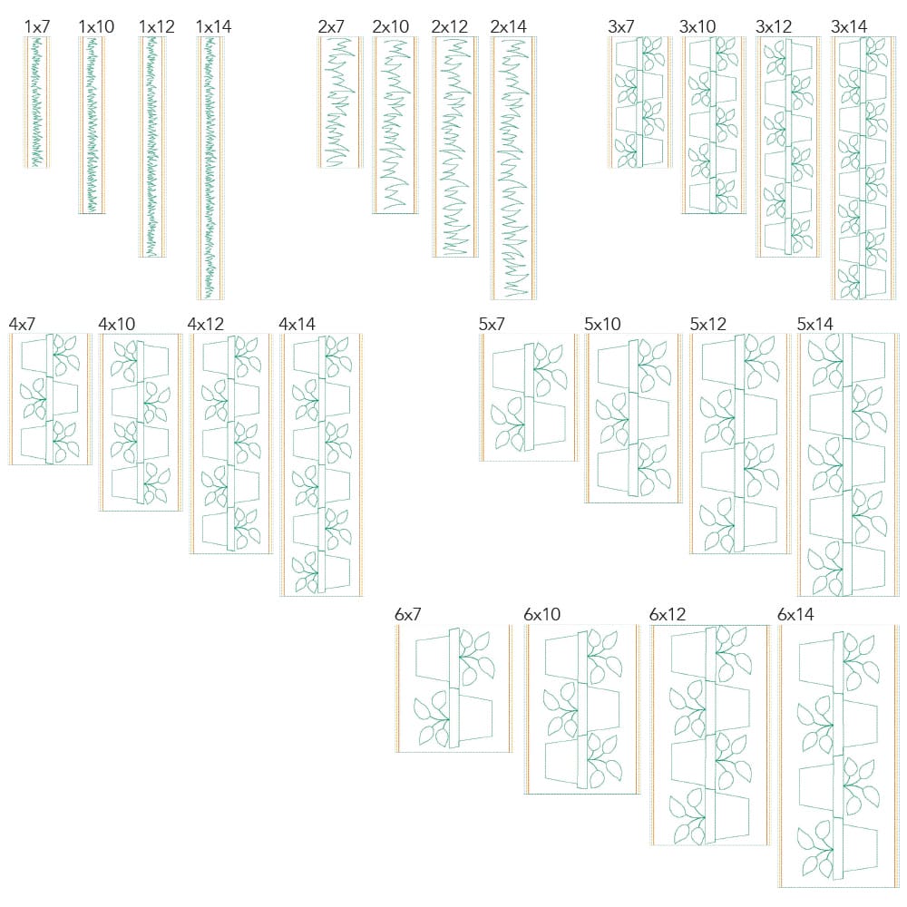 Again, your purchase of Plant Border 1 includes 48 file sizes: 24 files for the Clear Blue Tiles ® quilting method and 24 files for the Block-by-Block quilting method. Files will fit within any size of machine embroidery hoop from 5×7 up to 9×14!