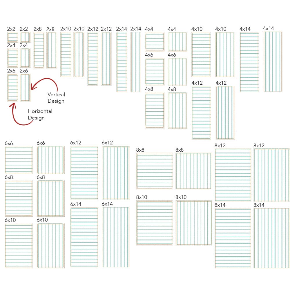 *All 44 files are designed to work with embroidery hoop sizes from 4x4 to 9x14. Check the Embroidery Field Size Chart to double check your machine's capabilities for each file size.