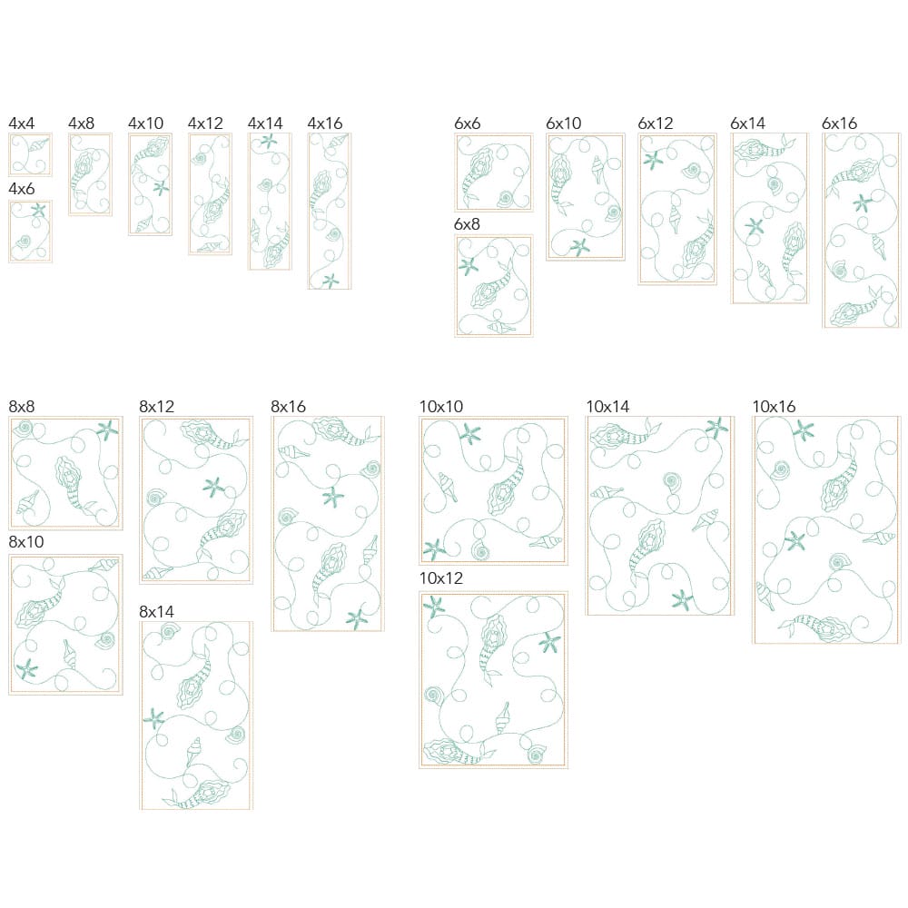 Again, your purchase of the large-scale Mythic 3 design includes 44 file sizes: 22 files for the Clear Blue Tiles quilting method and 22 files for the Block-by-Block quilting method. These large-scale design files fit within machine embroidery hoop sizes 4×4 to 10×16!