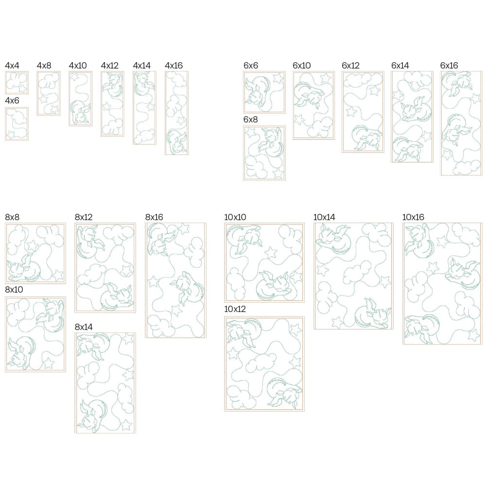 *All 22 files are designed to work with embroidery hoop sizes from 4×4 to 10×16. Check the Embroidery Field Size Chart to double check your machine’s capabilities for each file size.