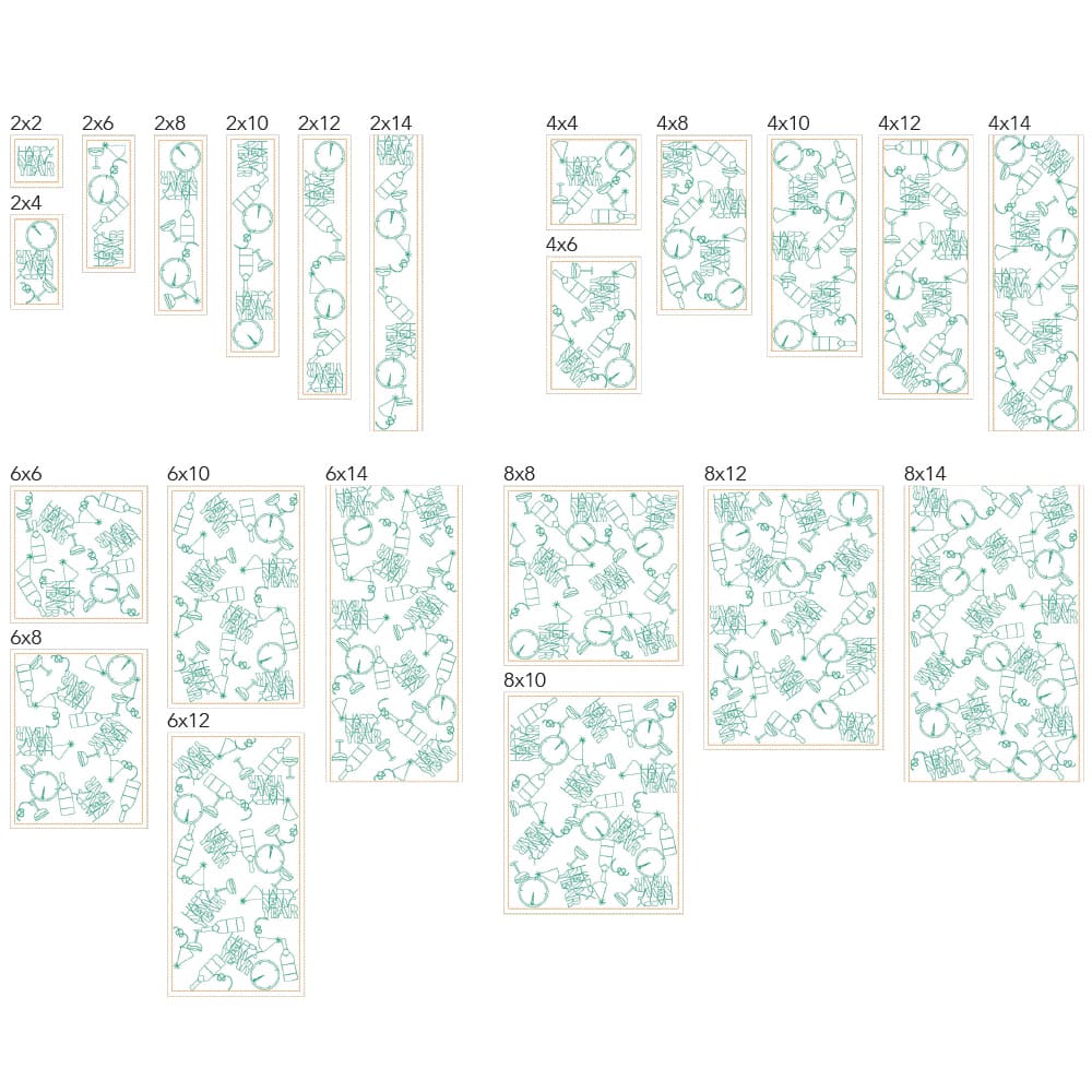Again, your purchase of New Year 1 includes 44 file sizes: 22 files for the Clear Blue Tiles ® quilting method and 22 files for the Block-by-Block quilting method. Files will fit within any size of machine embroidery hoop, from 4×4 up to 9×14!