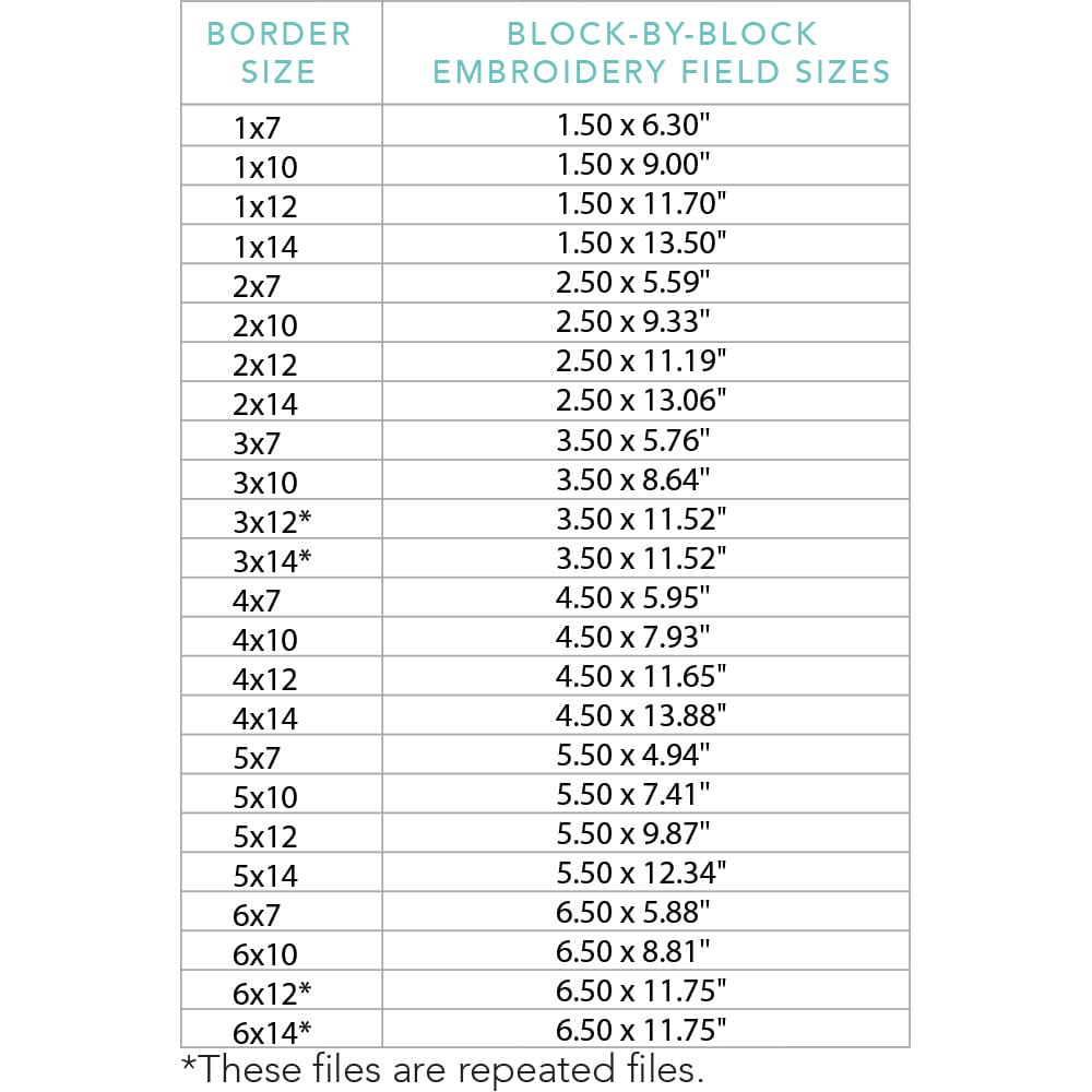 Again, your purchase of Orange Peel Border 2 includes 24 file sizes for the Block-by-Block quilting method, including 2 repeat files. Files will fit within any size of machine embroidery hoop from 5×7 up to 9×14!
