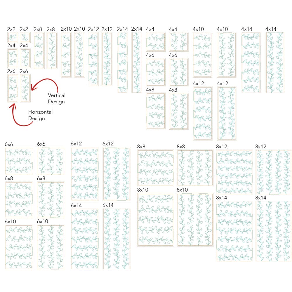 Again, your purchase of Plant 1 includes 44 file sizes for the Block-by-Block quilting method. Files will fit within any size of machine embroidery hoop from 4×4 up to 9×14!