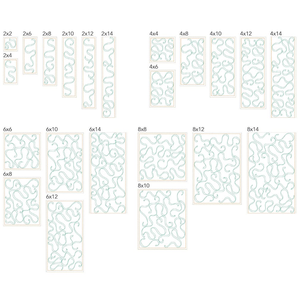 Again, your purchase of Ribbon 1 includes 44 file sizes: 22 files for the Clear Blue Tiles ® quilting method and 22 files for the Block-by-Block quilting method. Files will fit within any size of machine embroidery hoop, from 4×4 up to 9×14!