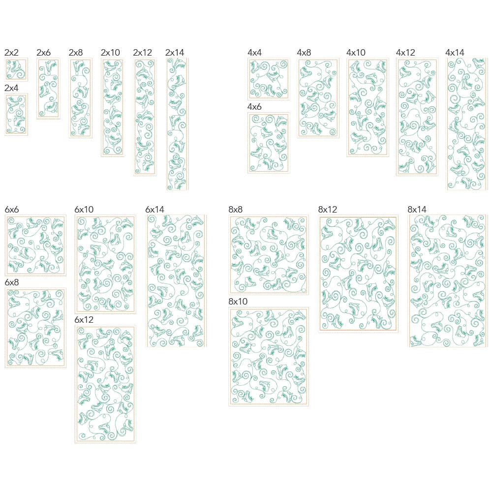 Again, your purchase of Skate 1 includes 44 file sizes: 22 files for the Clear Blue Tiles ® quilting method and 22 files for the Block-by-Block quilting method. Files will fit within any size of machine embroidery hoop, from 4×4 up to 9×14!