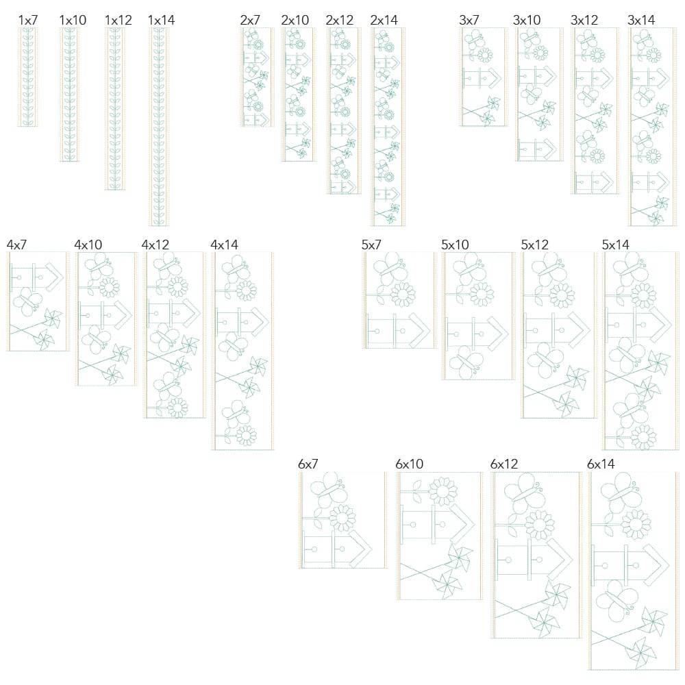 Again, your purchase of Spring Border 2 includes 24 file sizes for the Block-by-Block quilting method, including 0 repeat files. Files will fit within any size of machine embroidery hoop from 5×7 up to 9×14!