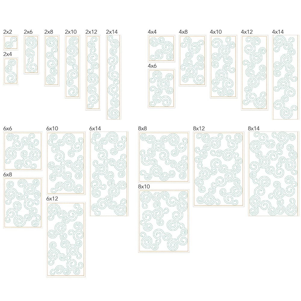 Again, your purchase of Swirl 3 includes 44 file sizes: 22 files for the Clear Blue Tiles ® quilting method and 22 files for the Block-by-Block quilting method. Files will fit within any size of machine embroidery hoop, from 4×4 up to 9×14!