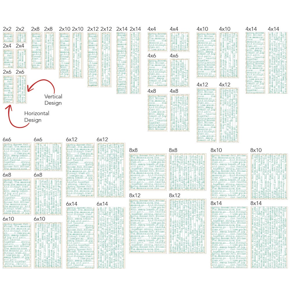 *All 44 files are designed to work with embroidery hoop sizes from 4x4 to 9x14. Check the Embroidery Field Size Chart to double check your machine's capabilities for each file size.