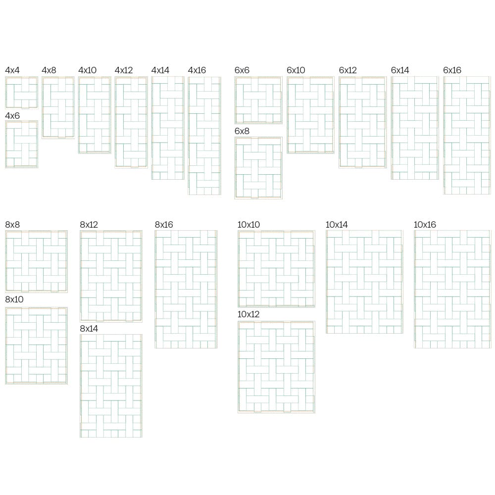 Again, your purchase of the large-scale Weave 3 design includes 22 file sizes: 22 files for the Block-by-Block quilting method. These large-scale design files fit within machine embroidery hoop sizes 4×4 to 10×16!