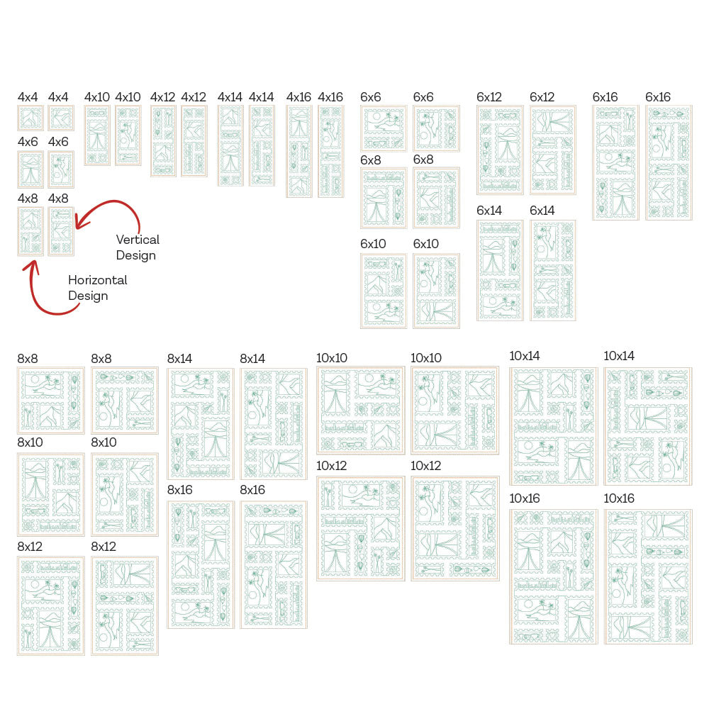 *All 44 files are designed to work with embroidery hoop sizes from 4x4 to 10x16. Check the Embroidery Field Size Chart to double check your machine's capabilities for each file size.