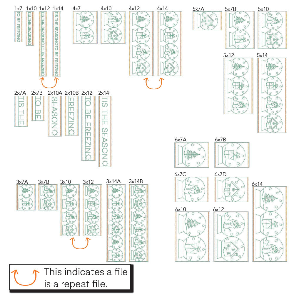 *All 32 files are designed to work with embroidery hoop sizes from 5x7 to 9x14. Check the Embroidery Field Size Chart to double check your machine's capabilities for each file size.