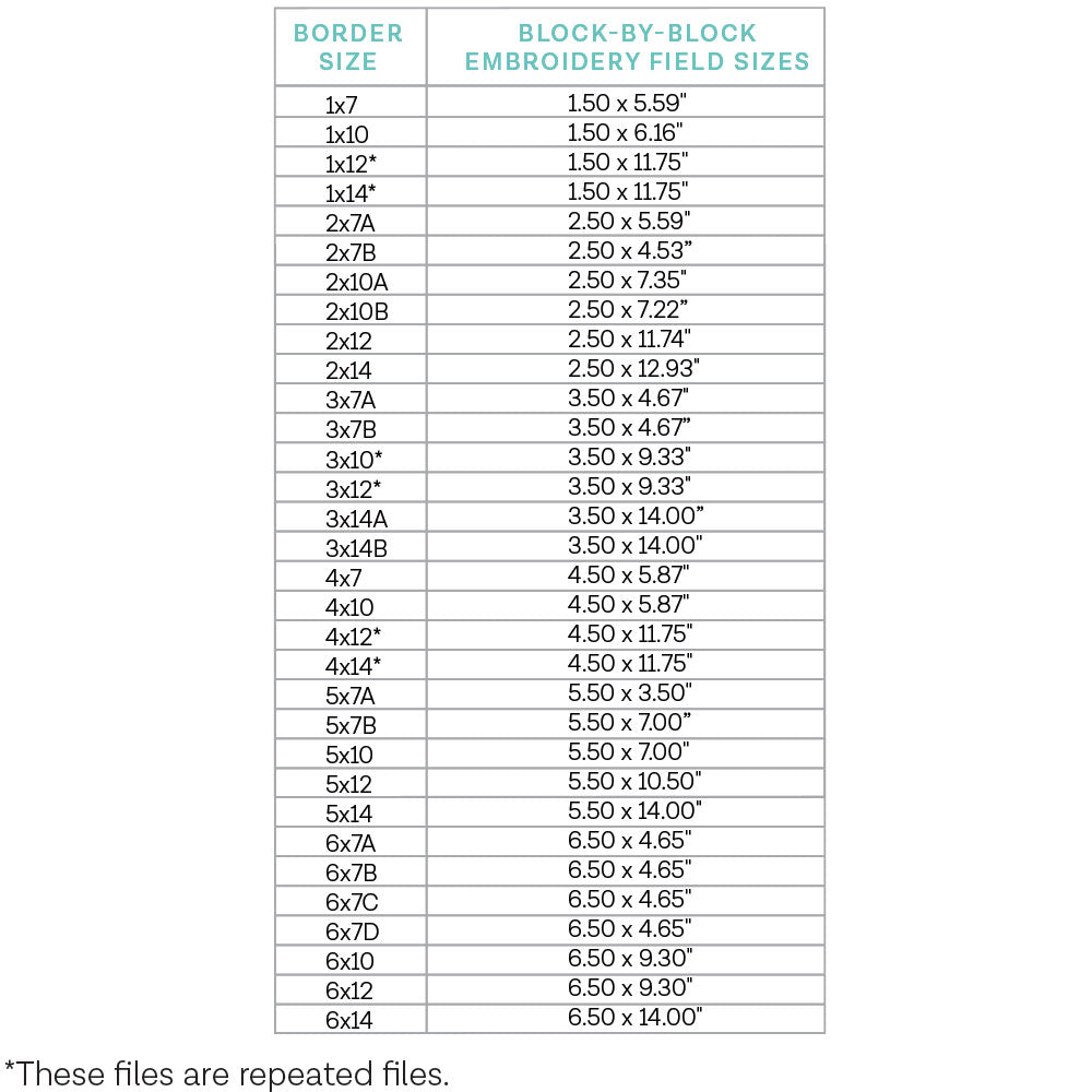 Block-by-Block border designs are specially digitized to eliminate batting in the seams and stitch continuously from one hooping to the next. Note that these designs have custom file lengths that sometimes result in repeated files.