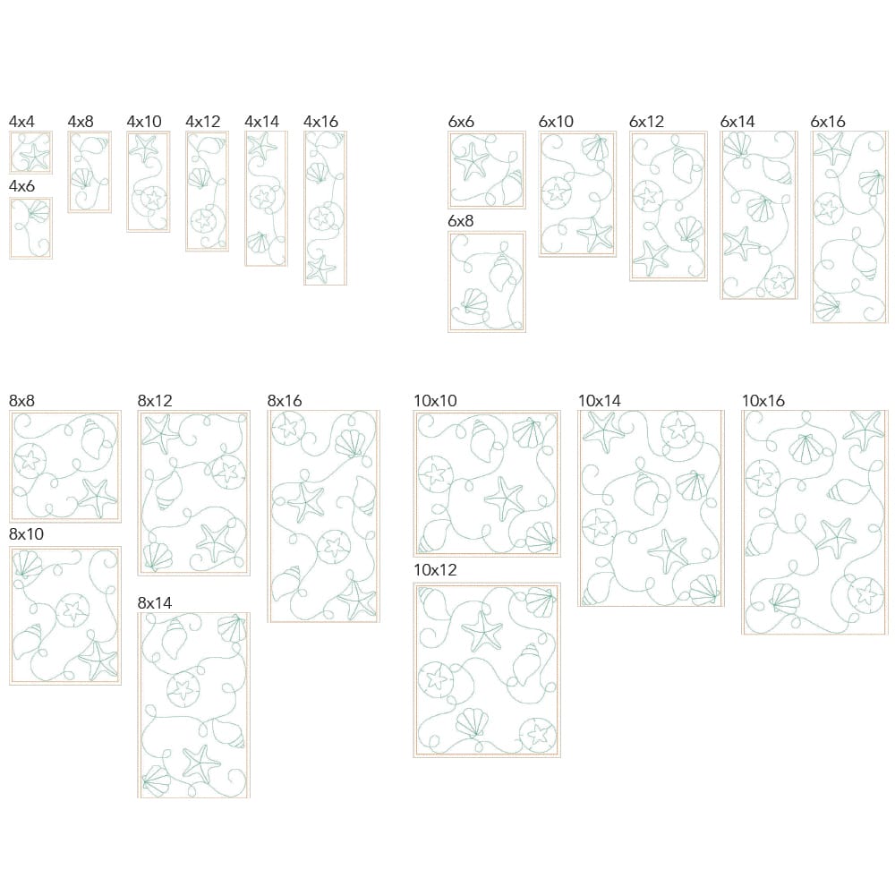 Again, your purchase of the large-scale Beach 2 design includes 44 file sizes: 22 files for the Clear Blue Tiles quilting method and 22 files for the Block-by-Block quilting method. These large-scale design files fit within machine embroidery hoop sizes 4×4 to 10×16!