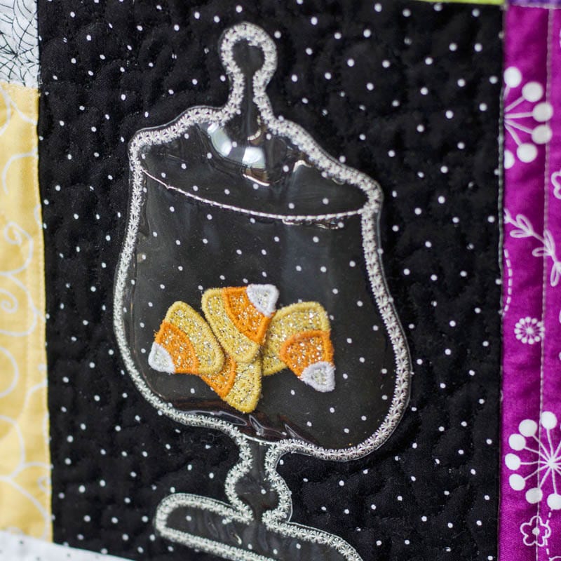 Come sit for a spell in Broomhilda’s Bakery where every ghoul-friend is welcome! Hang your hat and rest your witchy toes, while sampling the spooky sweets like Boo-Berry Pie and Rice-Creepy Treats. Kimberbell’s vinyl and glitter sheets conjure the cutest applique with charming frogs under glass, plus diva witch hats and high heels. All the extraordinary embellishments like Mylar candy corns and flowers, fuzzy fringed spiders, and Broomhilda’s collection of eyeballs will have you screaming in a good way.