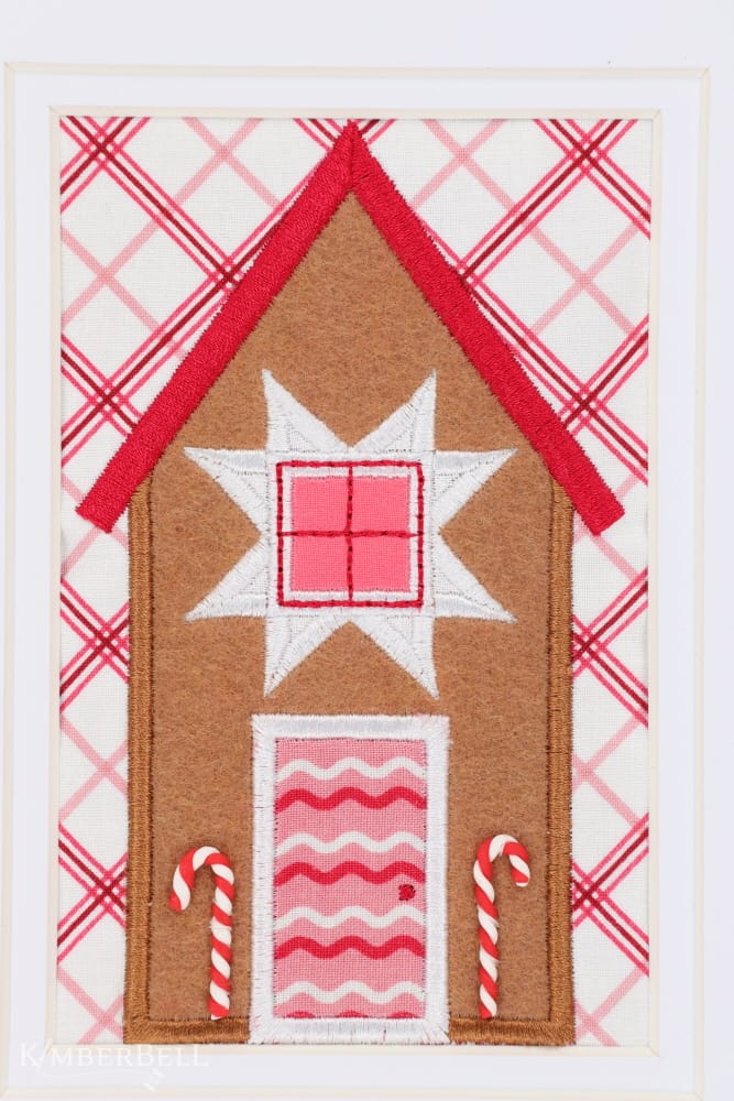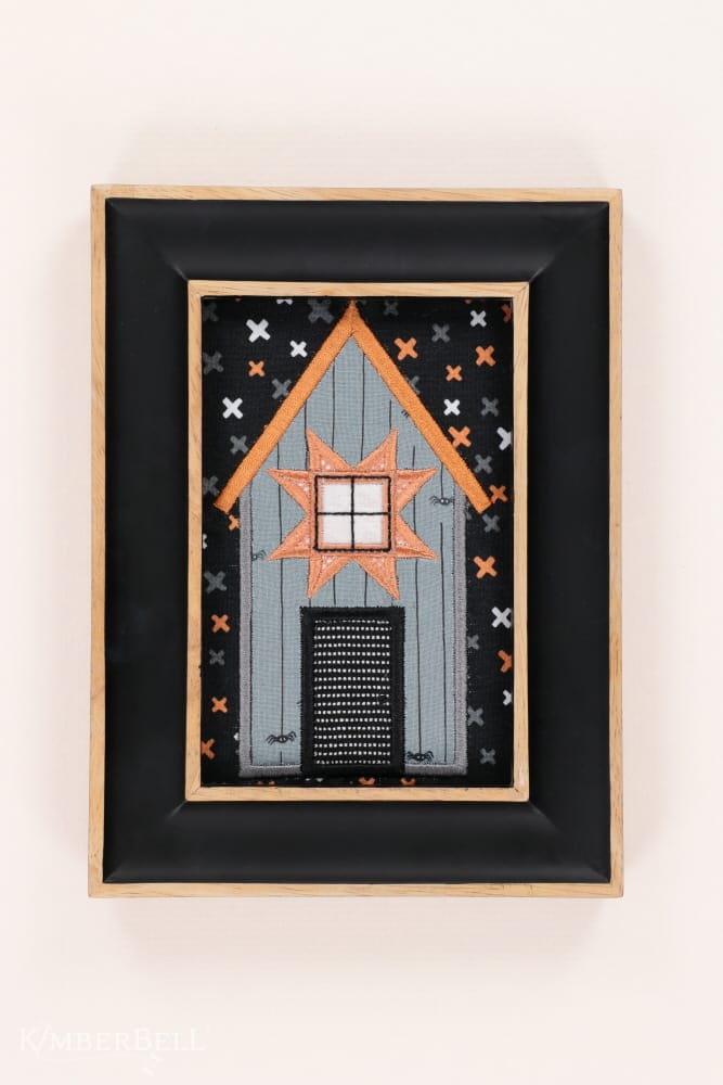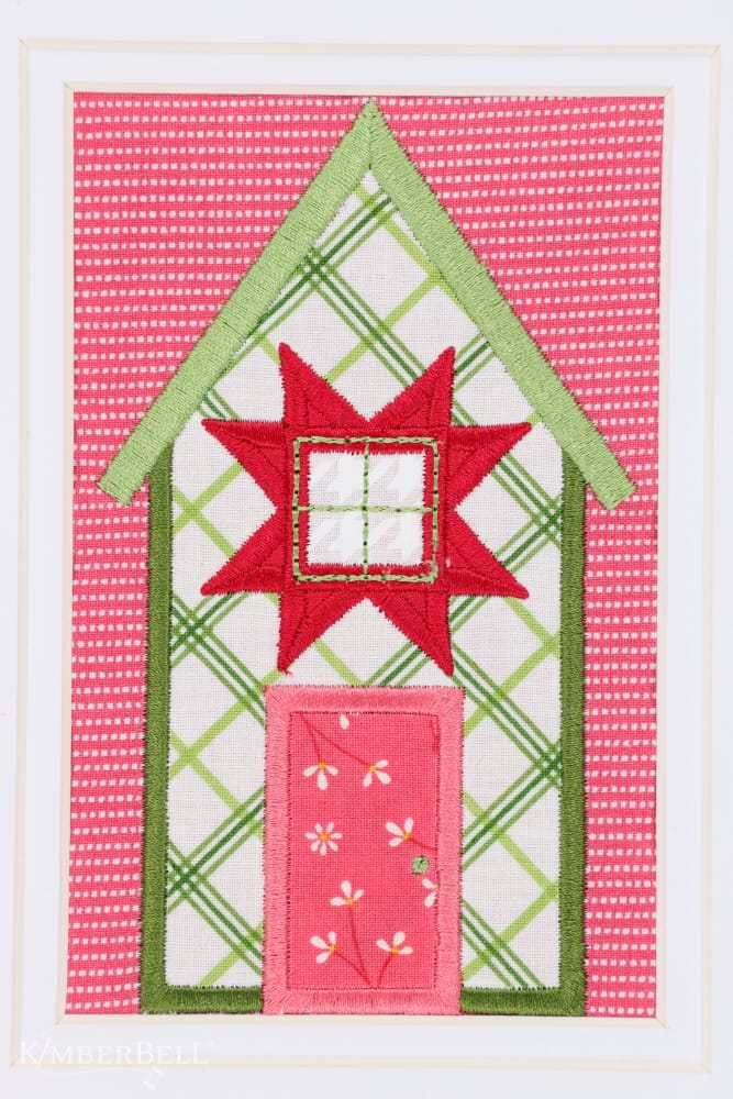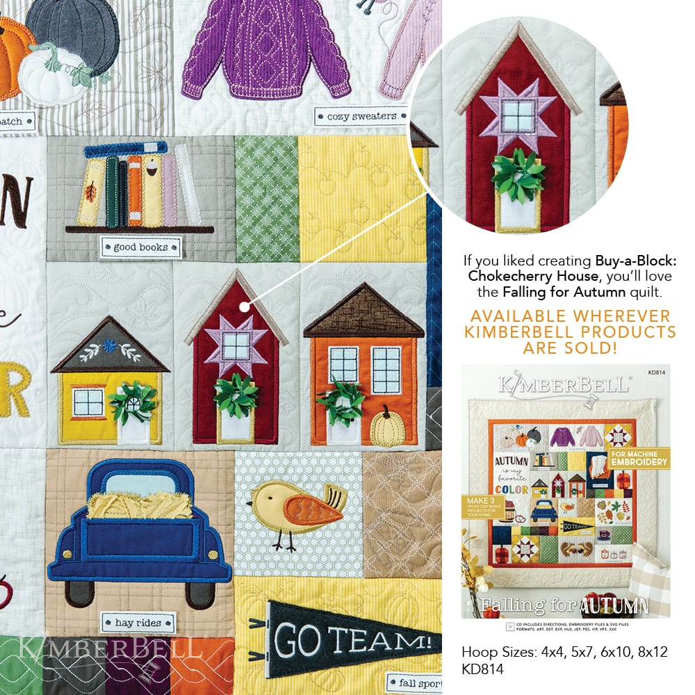 Stitch a warm and welcoming Chokecherry House from Kimberbell’s Falling For Autumn quilt! Made in a 5×7 machine embroidery hoop, this darling Buy-a-Block design features applique walls, a vinyl “glass” window, and a traditional star. For an extra dimensional touch, add a green wire wreath to the front door!