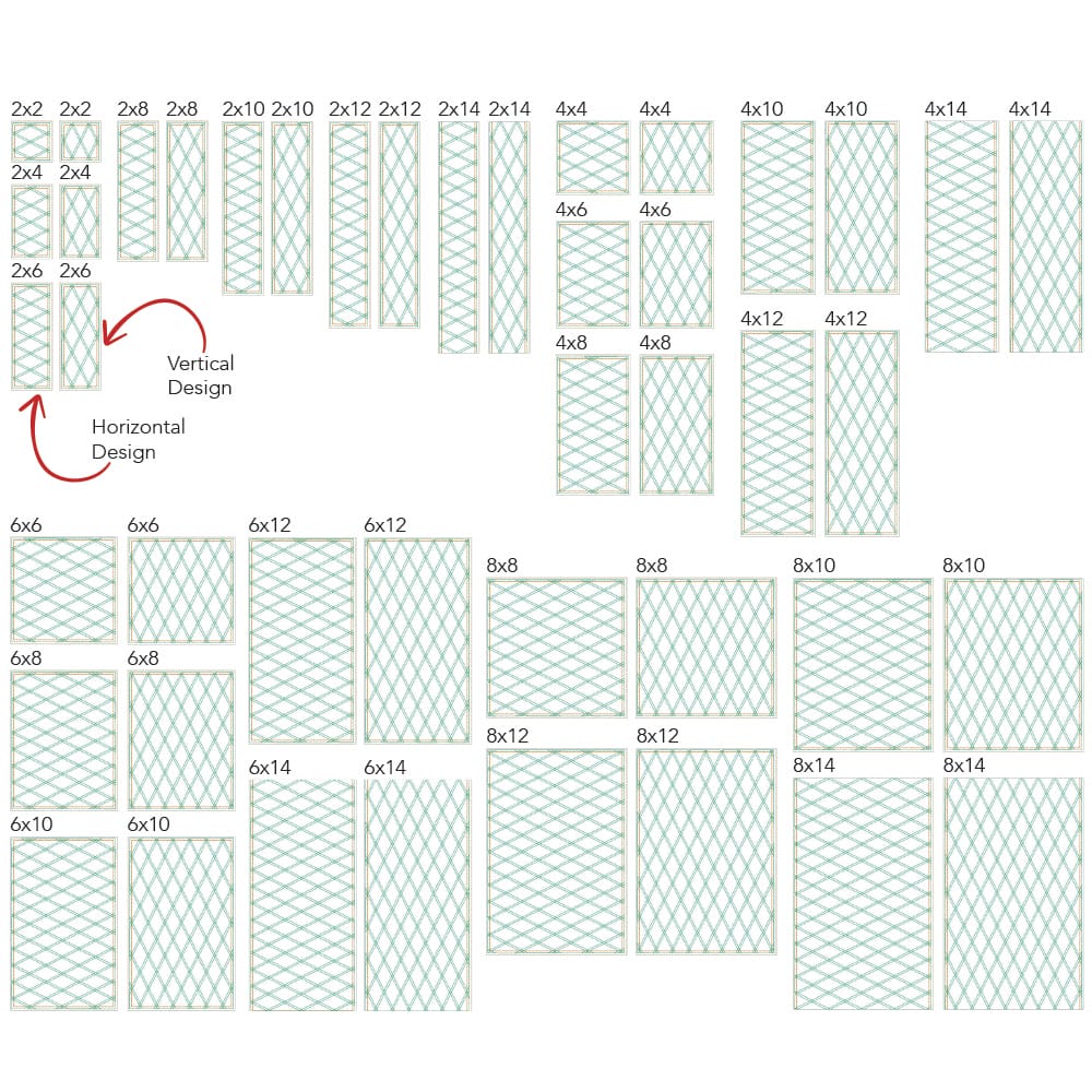 *All 44 files are designed to work with embroidery hoop sizes from 4x4 to 9x14. Check the Embroidery Field Size Chart to double check your machine's capabilities for each file size.