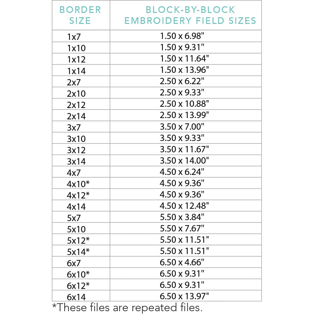 Again, your purchase of Diamond Border 1 includes 24 file sizes for the Block-by-Block quilting method, including 3 repeat files. Files will fit within any size of machine embroidery hoop from 5×7 up to 9×14!